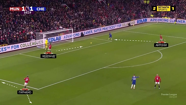 В самой радикальной форме модель прессинга могла выглядеть так: Хейлунд давит до вратаря, а Гарначо и Антони ориентируются на ЦЗ. То есть в первой линии нападающий и сразу два вингера, а не один. Тогда фланги «Челси» оставались более свободными: