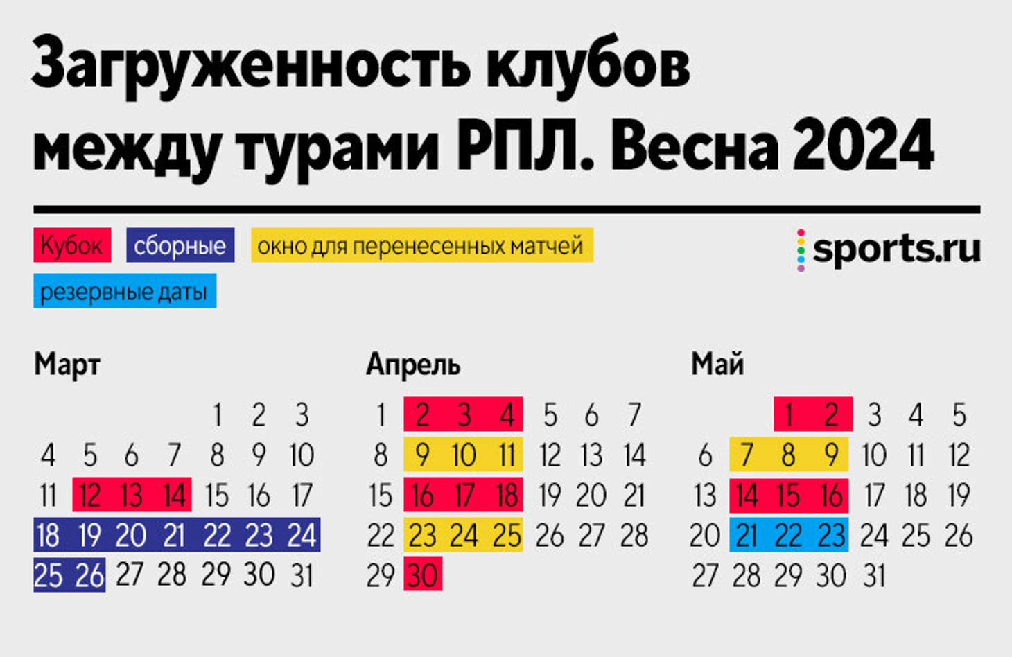 Исходя из календаря РПЛ, мартовского созыва сборной и Кубка, окон для переноса по ходу сезона три: 9-11 апреля, 23-25 апреля, 7-9 мая. Плюс резервные даты – 21-23 мая. На 5-7 марта переносить – странно. Такая же вероятность снегопадов и морозов, как и в декабре.