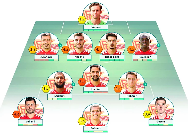 «Унион»: Rønnow - Juranović, Knoche, Leite, Roussillon - Laïdouni, Khedira (c), Haberer - Volland, Behrens, Gosens