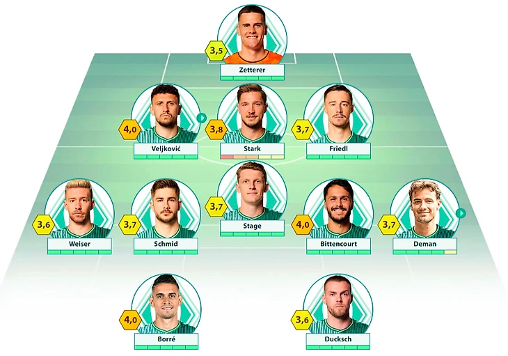 «Вердер»: Zetterer - Veljković, Stark, Friedl (c) - Weiser, Schmid, Stage, Bittencourt, Deman - Borré, Ducksch