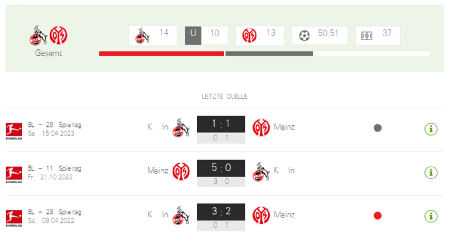 - Общий баланс встреч между командами: 8 побед на счету «Майнца», 6 побед на счету «Кельна» и 8 ничьих.