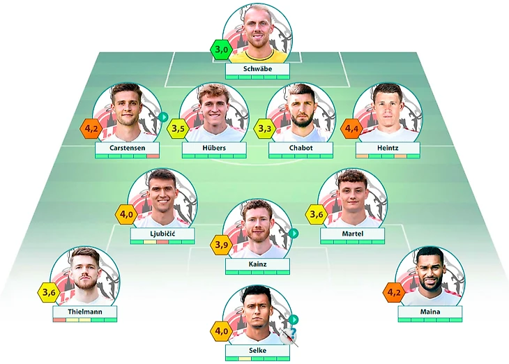 «Кельн»: Schwäbe - Carstensen, Hübers, Chabot, Heintz - Martel, Ljubicic - Thielmann, Kainz (c), Maina - Selke