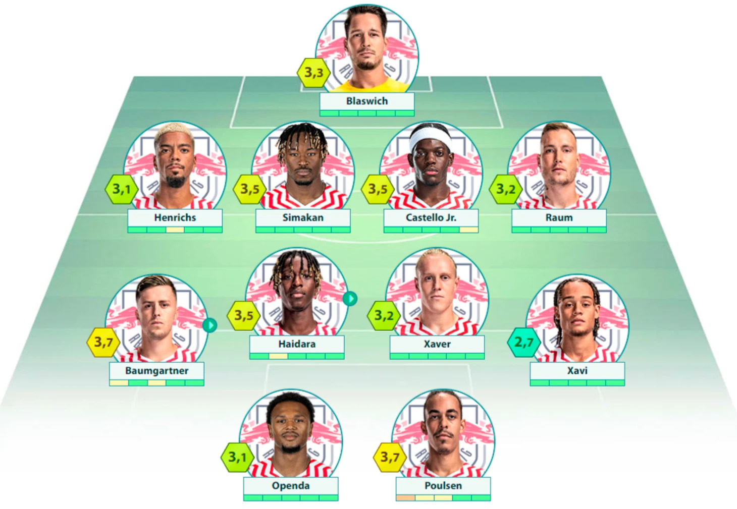 «РБ Лейпциг»: Blaswich - Henrichs, Simakan, Castello, Raum - Xavi, Schlager, Haidara, Baumgartner - Openda, Poulsen (c)