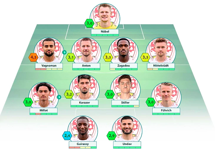 «Штутгарт»: Nübel - Stenzel, Anton (c), Zagadou, Mittelstädt - Millot, Karazor, Stiller, Führich - Undav, Guirassy