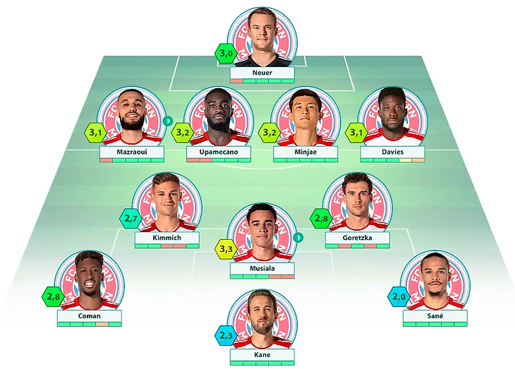 «Бавария»: Neuer (c) - Mazraoui, Upamecano, Kim, Davies - Kimmich, Goretzka - Sané, Musiala, Coman - Kane
