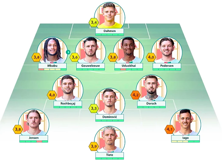 «Аугсбург»: Dahmen - Gumny, Gouweleeuw, Uduokhai, Pedersen - Rexhbecaj, Dorsch - Jensen, Demirović (c), Iago - Tietz