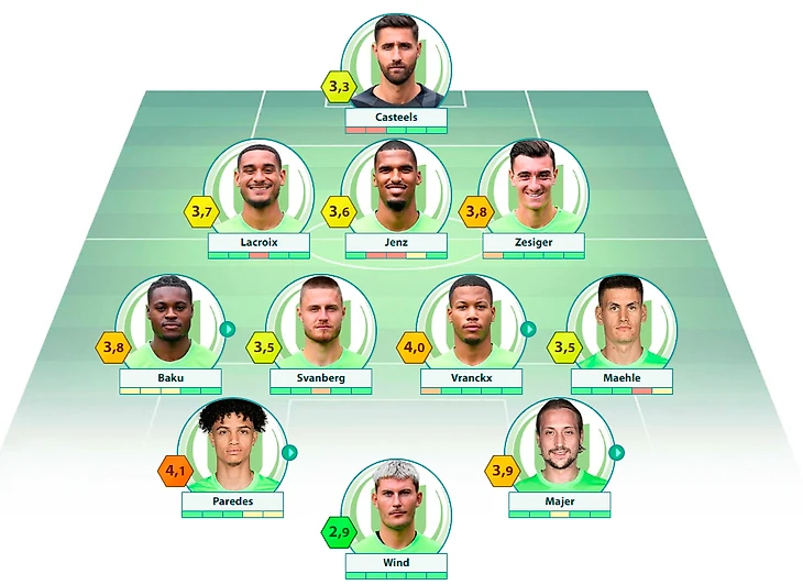 «Вольфсбург»: Casteels (c) - Lacroix, Jenz, Zesiger - Maehle, Svanberg, Vranckx, Gerhardt - Černý, Wind, Paredes