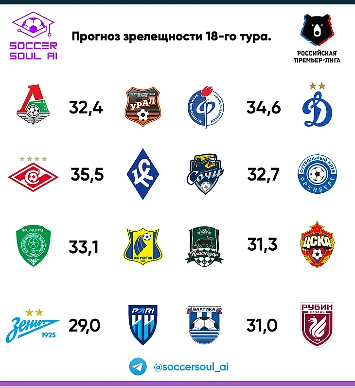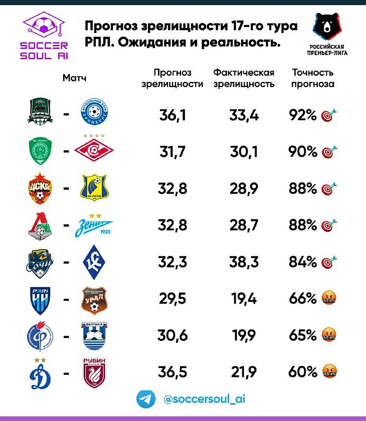 Из двух, ожидающихся самыми зрелищными матчей, выстрелил только один. Тактическую трансформацию Динамо я уже затрагивала в публикациях телеграм-канала https://t.me/soccersoul_ai , а вот Спартак с Ахматом показали наиболее зрелищный в туре матч. При этом, если Спартак до своего уровня недотянул (17,1 вместо ожидаемых 21,5), то Ахмат был в рамках собственной статистики (16,3 / 16,1).