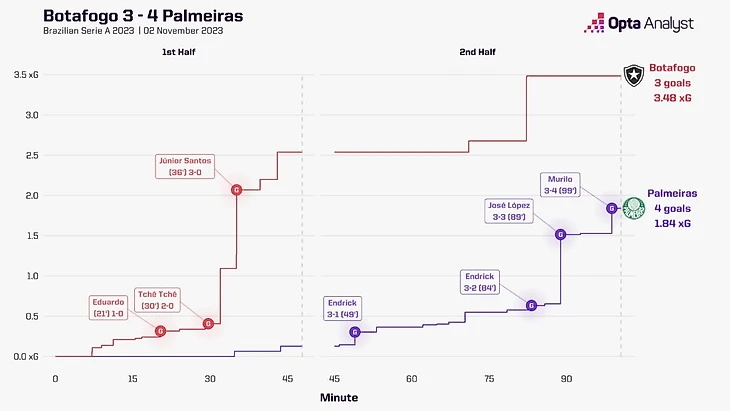 Эти три победы позволили им уверенно встрепенуться перед важнейшим матчем против «Ботафого». Перед сражением они все еще отставали от «Ботафого» на шесть очков, сыграв на игру больше. Проигрывая со счетом 3-0 к 36-й минуте матча, их слабые надежды на титул выглядели полностю фантастичными. «Ботафого» был неудержим: их 15 ударов за первые 45 минут были максимальным показателем, с которым «Палмейрас» когда-либо сталкивался в матче под руководством Абеля Феррейры, при том ни в одной из своих игр «Ботафого» не нанес более семи ударов в створ ворот за тайм. Лидеры лиги в первом тайме. Но у «Палмейраса» повторюсь был Эндрик.
