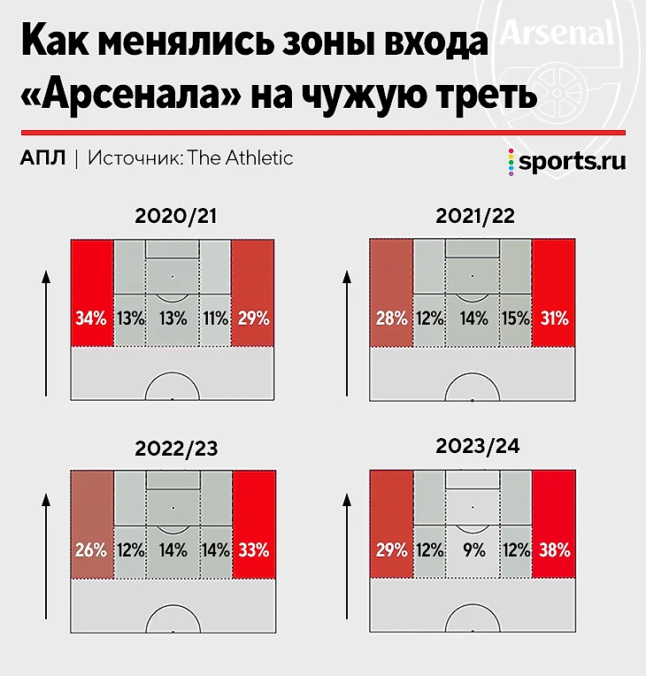При смене позиции Райс стал реже пасовать как на чужую половину поля, так и в финальную треть. Более того, «Арсенал» так чаще пропускает. Разница не такая критичная, но на позиции шестерки англичанин более эффективен.