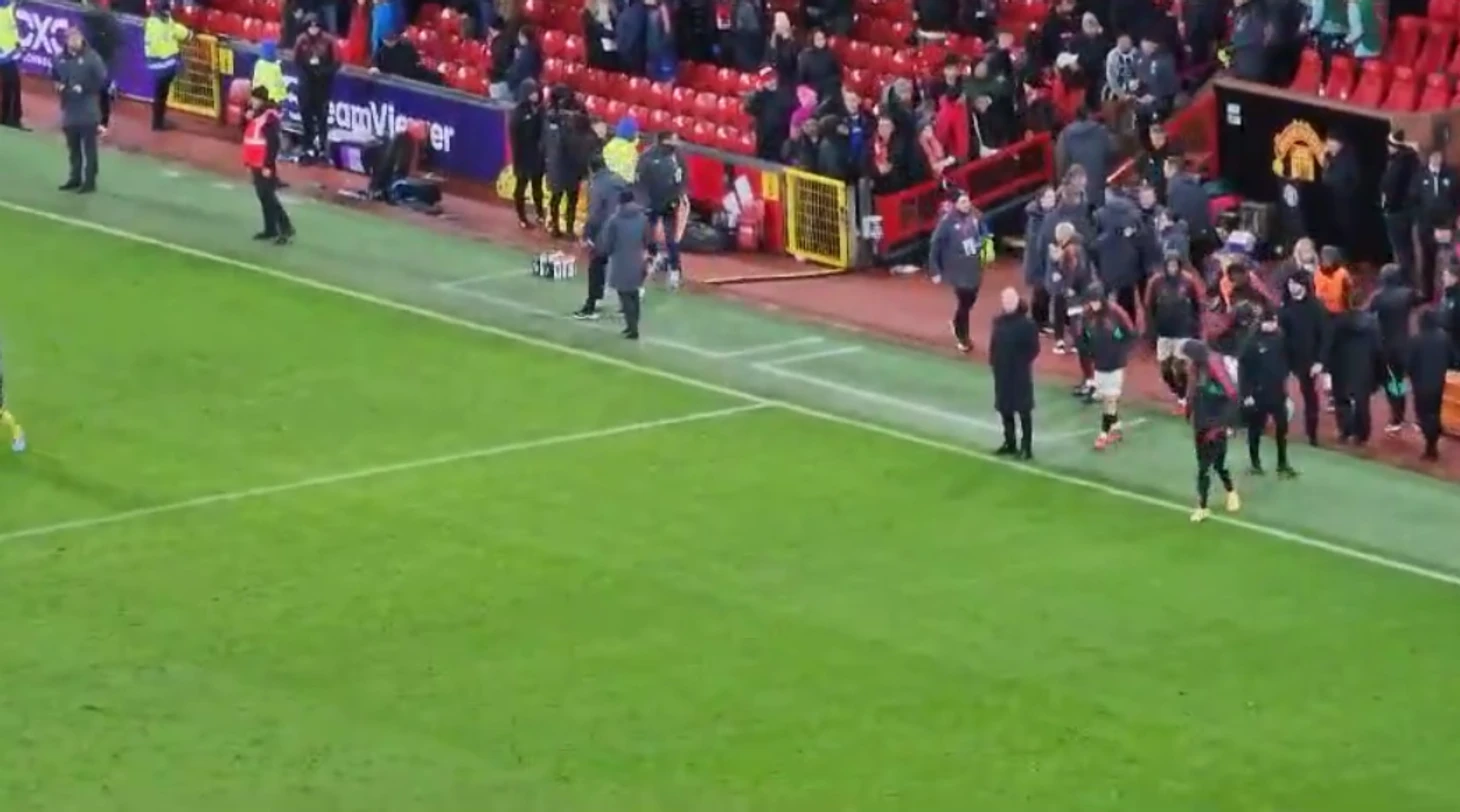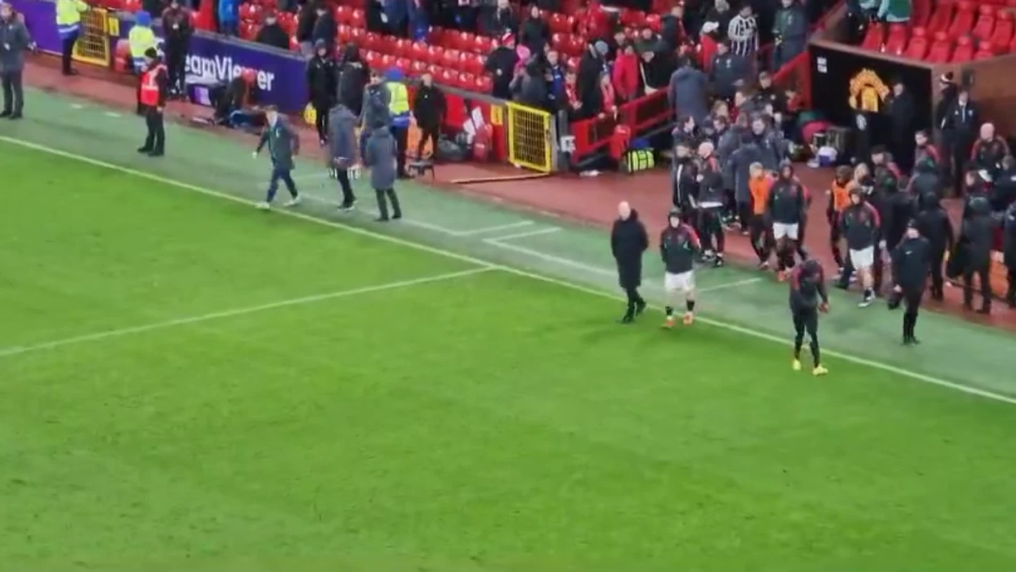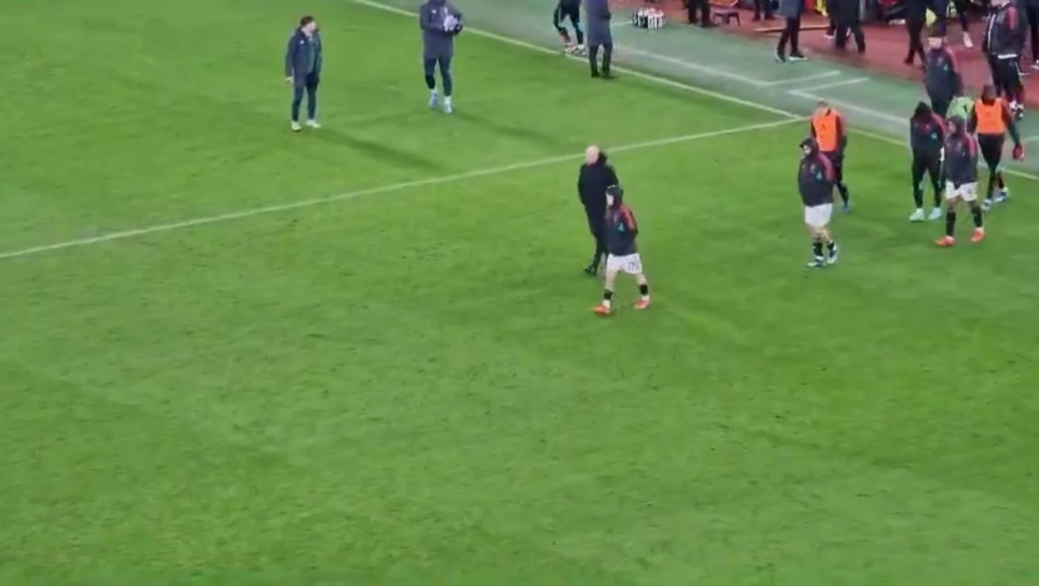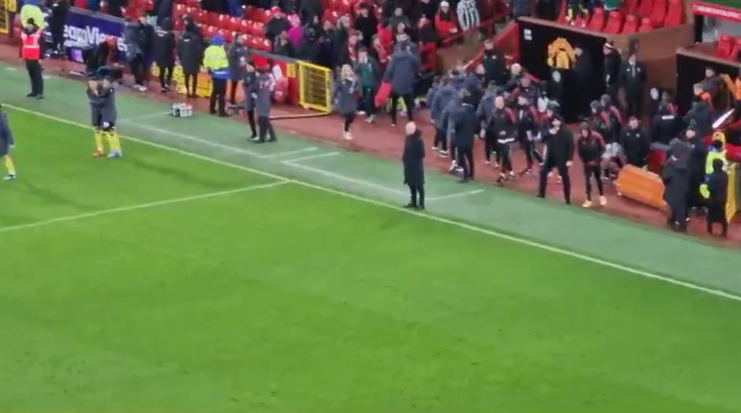Болельщик снял с трибуны видео, как главный тренер манкунианцев стоит как будто в прострации на боковой линии, пока все остальные представители штаба и игроки направляются в подтрибунное помещение или в сторону газона. Это продлилось как минимум 10 секунд.