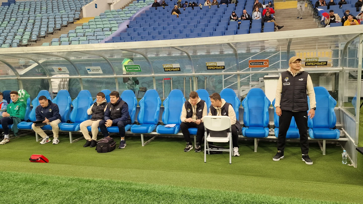 На тренерском мостике - исполняющий обязанности главного тренера ФК «Сочи» Денис Клюев. Позже на экранах, установленных на стадионе, показали его предшественника Александра Точилина, который присутствовал на игре и смотрел матч из ложи.