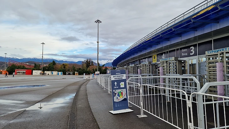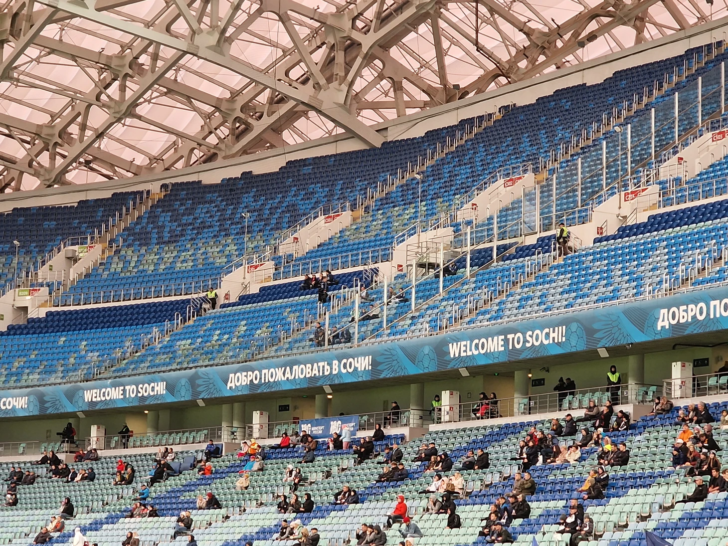 Благо, в воскресный день «пробок» на дорогах не было и за полчаса с небольшим мы добрались до стадиона. На остановке «Вагонное депо» в Адлере автобус остановился, но в него так никто и не подсел. На подъезде к Олимпийскому парку организаторы устроили внезапную лотерею, в результате которой я выиграла очень симпатичный шарф с символикой ФК «Сочи», а другой пассажир - фрибет на 3000 рублей.