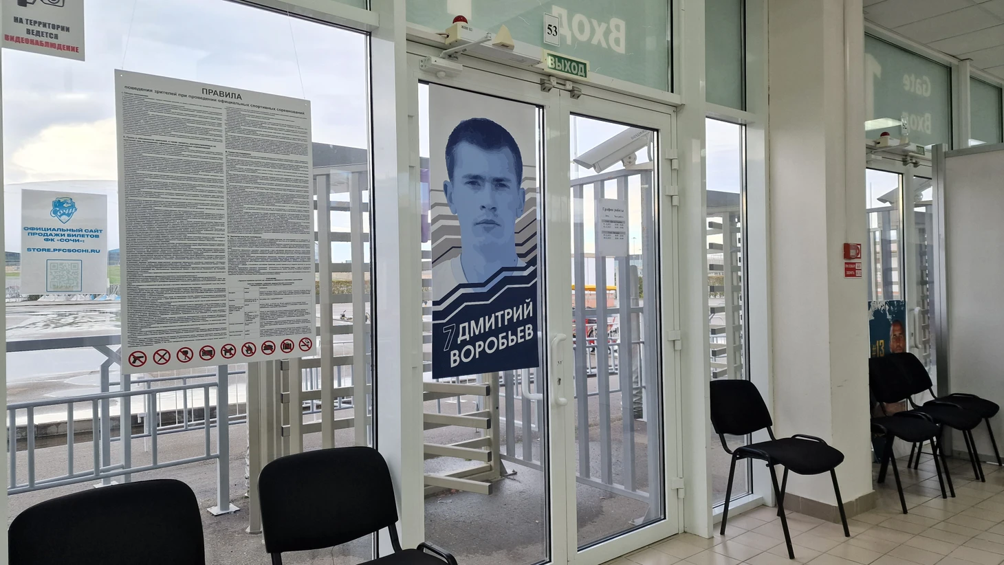 Отделение МФЦ украшают портреты футболистов ФК «Сочи» в оригинальной синей стилистике в цветах клуба.