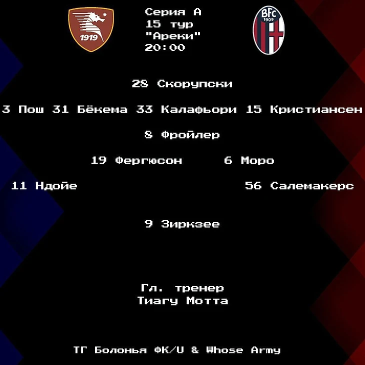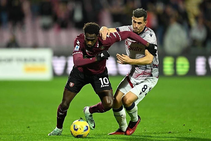 В стартовом составе - несколько неожиданностей. По-видимому, Мотта не рассматривает Калафьори в качестве левого защитника: Риккардо всегда выходит в центре, вопрос лишь в том, кто составляет ему пару. Сегодня это был Сэм Бёкема. В центре поля вышли Моро и Фройлер: последний заменил в старте Эбишера, который последние пару матчей слишком часто ошибался. Происходившее в первом тайме уже блистательно описано на Газете кальчо. Добавить остаётся лишь небольшие штрихи, конкретику. БФК доминировала на поле до 40', а уже к 20' забила два мяча. Оба - на счету Джошуа Зиркзее. Сначала он, избежав офсайда, подправил мяч в сетку после неудачного сэйва от Бенуа Костиля. Затем убежал 1 на 1 с вратарём и переиграл его: во втором мяче «Россоблу» отличную работу проделал Салемакерс, запрессинговавший соперника и вынудивший того неаккуратно отпасовать назад. Второй тайм, вплоть до 70', вновь явил превосходство «Болоньи». Команда Мотты действовала чуть менее нацеленно, но все так же синхронно. Минимум свободного пространства, длительные отрезки владения. Самый опасный момент в эти минуты - на счету Фергюсона. Шотландец получил своевременный пас от Зиркзее, но не сумел переиграть Костиля: французский вратарь отбил удар полузащитника «Болоньи» в штангу. Ход встречи изменила одна единственная замена Филиппо Индзаги. Он выпустил Нванкво Сими, экс-брмбардира «Кротоне», который не забивал 785 дней. Угадать, что произошло, несложно. Нигериец провел мощный матч, став магнитом для атак хозяев, и сумел пробить Скорупского, отправив мяч в сетку точно с линии штрафной после элегантного паса пяткой Антонио Кандревы. Оставшееся время «Салернитана» посвятила забросам в штрафную «Болоньи». Команда Мотты ценой неимоверных усилий сумела отбиться. Было очень непросто: страсти накалились до предела, футболисты «Салерно» готовы были убить Салемакерса, который провел выдающийся матч и посадил на карточки пол-команды соперника. В общем, эта «Болонья» любит играть с нервами болельщиков. Так или иначе, первая выездная победа в сезоне - есть!
