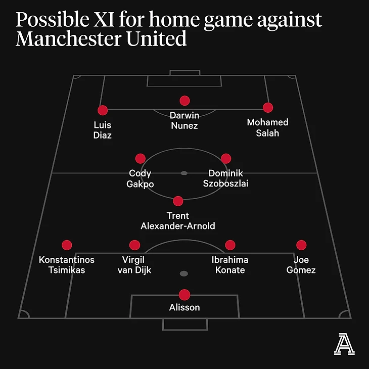 То, как «Ливерпуль» был настроен на тот момент, когда Коди Гакпо заменил неэффективного Райана Гравенберха, кажется хорошим местом для старта против «Юнайтед», если только травмированный Алексис Мак Аллистер не сможет вернуться на поле.