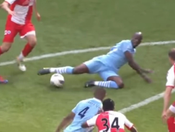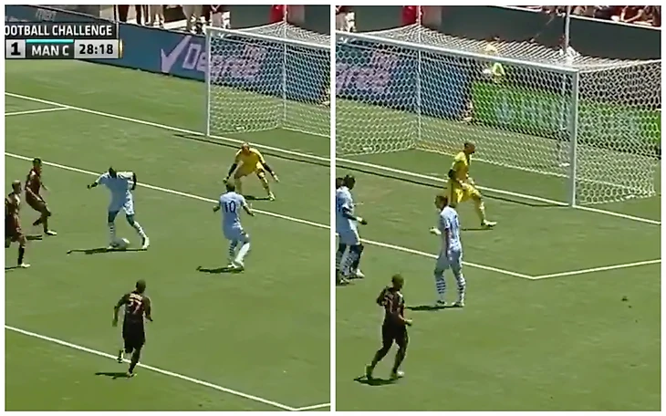 Во время предсезонного тура по США в 2011-м Марио пытается дерзко забить пяткой – но мажет и отправляется на скамейку: американцы гундят от радости, но Роберто Манчини в ярости.