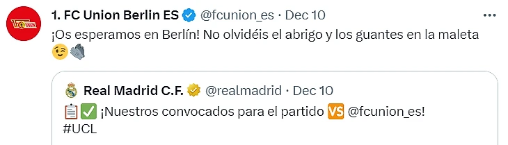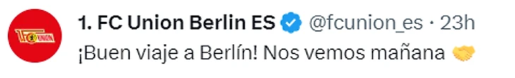 Испаноязычный аккаунт «Униона» пожелал сливочным удачной дороги: «Приятной поездки в Берлин! Увидимся завтра».
