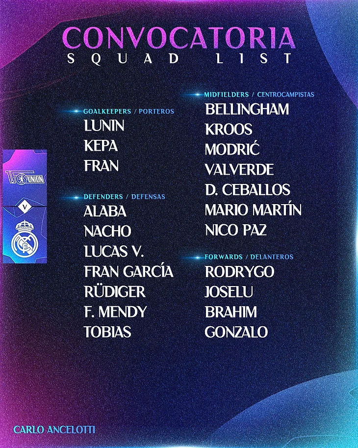 В последнем туре группового этапа Лиги чемпионов «Реал» встретится с «Унионом». Анчелотти определился с футболистами, которые отправятся в Берлин.