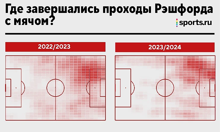 В этом сезоне на левой половине поля у Рэша нет союзников уровня Лисандро Мартинеса и Люка Шоу. Мяч доставляется медленнее. Косвенным отражением этого стали и проходы с мячом. Маркус вынужден чаще тащить мяч сам и идти в обводку. При отлаженной доставке такой необходимости было меньше:
