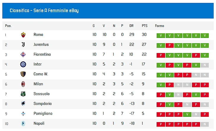 Турнирная таблица женской Серии А после десятого тура: