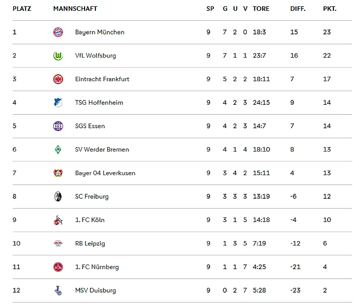 Турнирная таблица женской Бундеслиги после девятого тура: