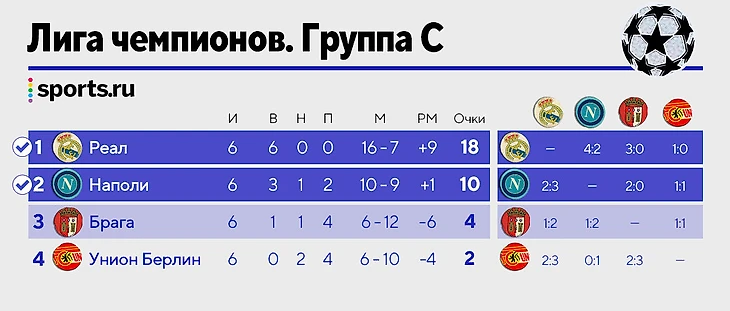 «Унион» вел 1:0 и проигрывал 1:2, забивали Кевин Фолланд и Алекс Крал – да-да, экс-спартаковец положил «Реалу»! Но дубль Хоселу (на этот раз извиняться не пришлось) и победный от Дани Себальоса на 88-й с паса Джуда Беллингема принесли «Мадриду» шестую из шести победу в группе. Идеальные.