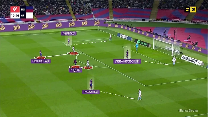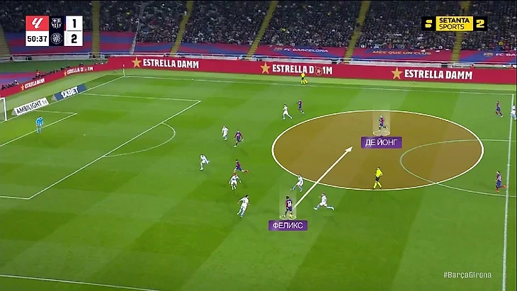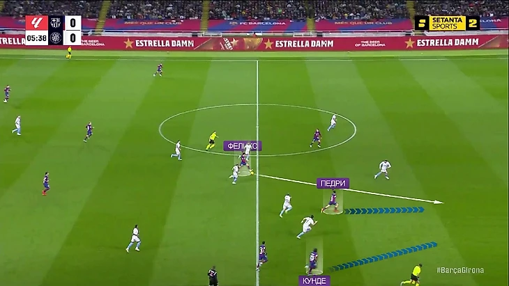 Поначалу у «Жироны» в этой стадии была проблема – разрыв между прессингующей группой и остальной командой. Например, в этом эпизоде Педри и Феликс вообще без опеки и «Барса» через них организует очень опасную атаку: