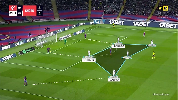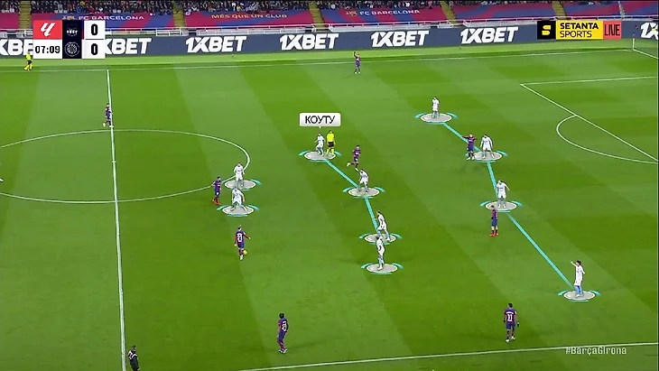 В прессинге «Жирона» использовала похожую на «Барсу» модель – есть пятёрка игроков, которая поддерживает компактность, а на флангах ловушка схлопывается и у каждого есть прямой оппонент: