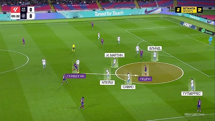Вот пример – здесь на первый взгляд ничего особенного не происходит: Гюндоган и Педри, как и всегда, играют по опорникам. Но на деле же, когда мяч идёт от Гассаниги на Ивана Мартина, Гюндоган играет с ним максимально пассивно – даёт принять мяч, развернуться и подумать: