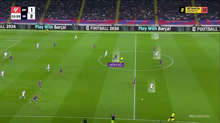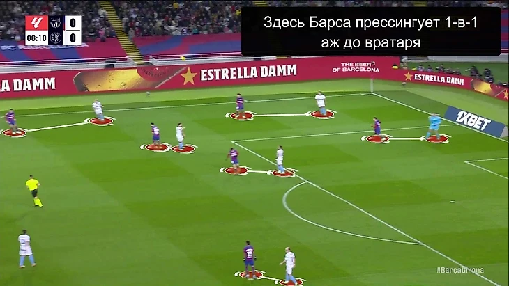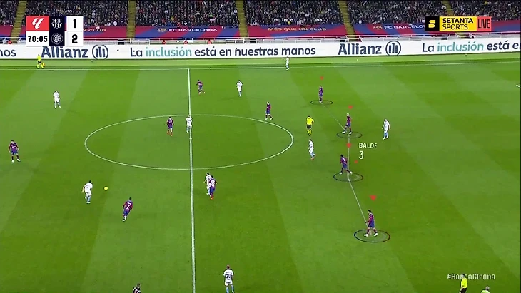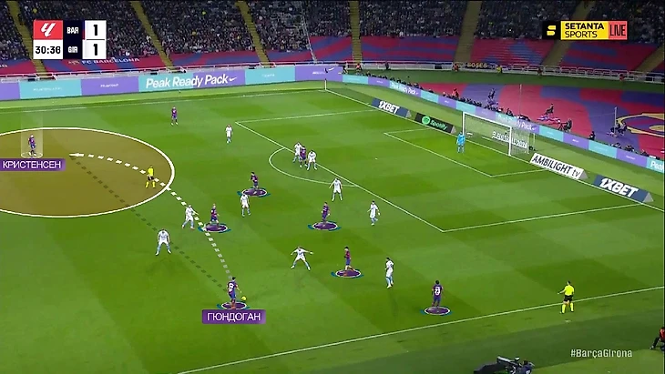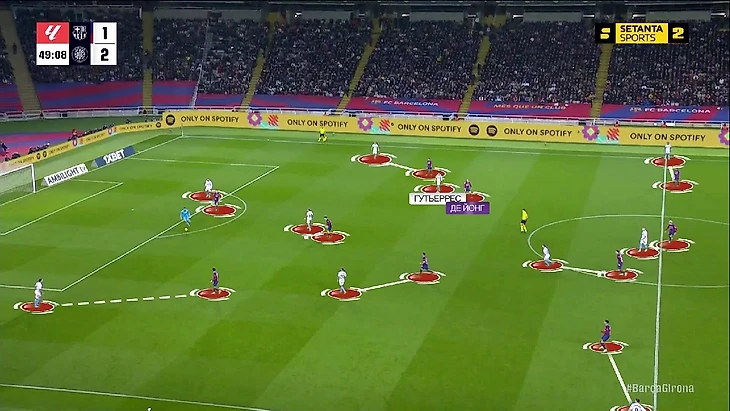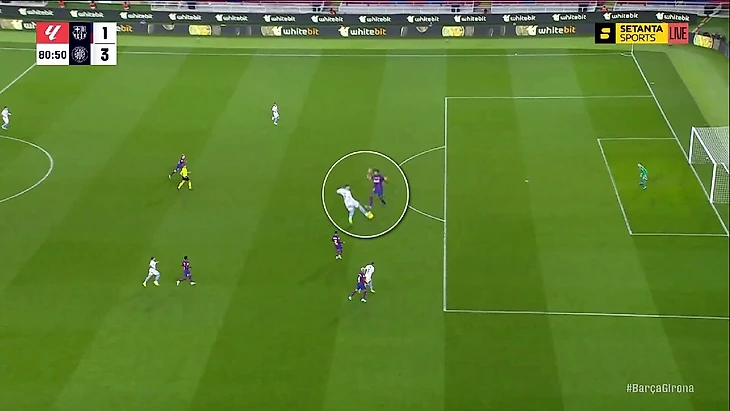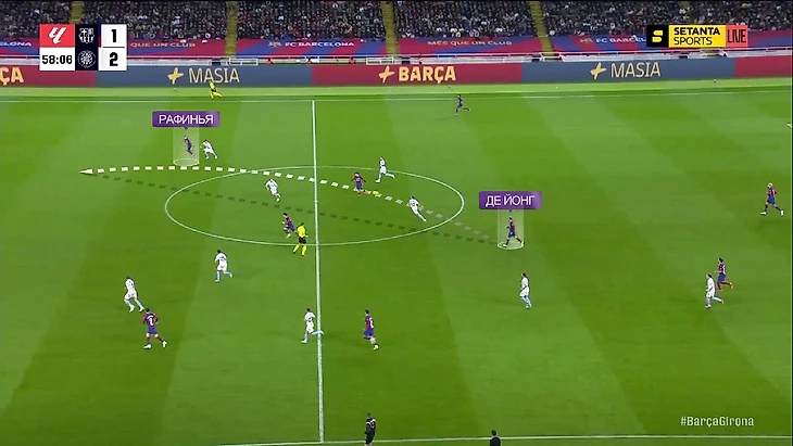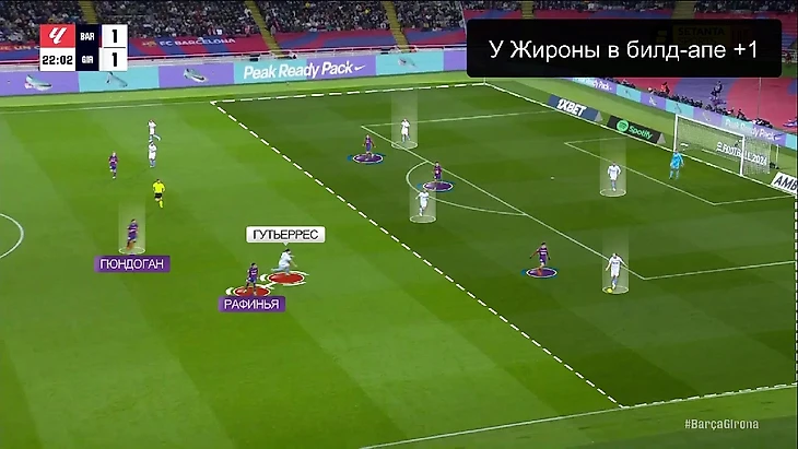 Структурно в прессинге «Барселоны» ничего не изменилось: пятёрка игроков смещается по мячу, на флангах создаёт ситуации 1-в-1 – классика для многих команд, в том числе и «Жироны» (об этом мы уже говорили):