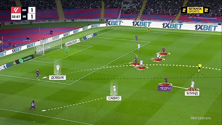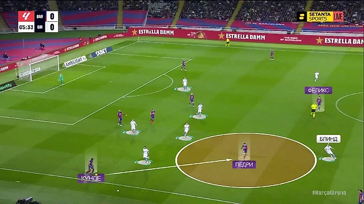 Но затем Блинд стал плотнее выдвигаться на Педри и прессинг «Жироны» стал лучше ограничивать «Барсу» – хозяева часто играли длинными безадресными передачами в такие моменты и владение переходило к «Жироне»: