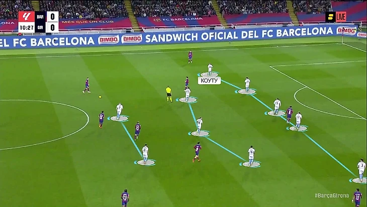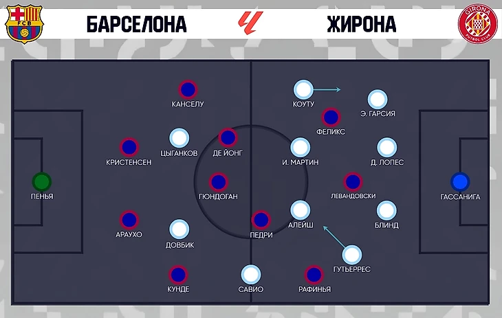 Стартовый план «Жироны» отличался от классики. Мичел явно понимал, что его команде придётся намного меньше владеть мячом, чем обычно, поэтому приготовил гибридную схему – 4-4-2, которая за счёт позиции Коуту превращалась в 5-3-2: