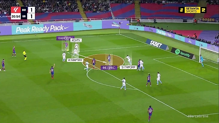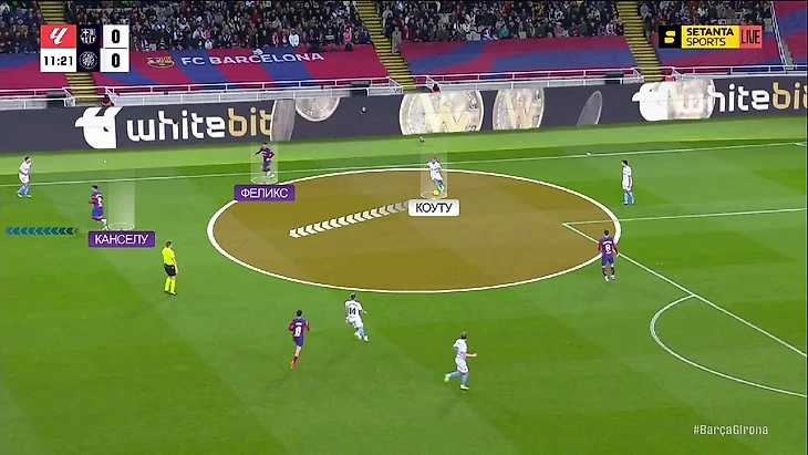 Первый гол тоже родился из ошибки «Барсы» в прессинге. Эпизод вообще начался с перевода на Канселу, но там Жоау оказался на газоне, а мяч достался «Жироне». После этого Канселу решил вернуться назад вместо того, чтобы оказать давление на Коуту. В итоге бразилец оказался вообще без давления (Феликс тоже решил его не встречать), он спокойно протащил мяч и отдал предголевой пас: