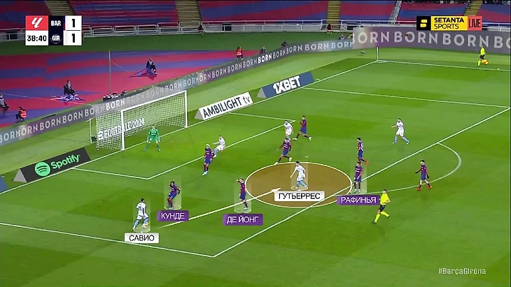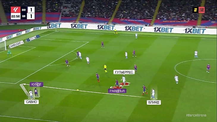 И вот из-за этой блуждающей роли Гутьерреса игроки «Барсы» либо были вынуждены идти за ним в неудобные зоны, либо же просто теряли его из вида. Например, в этом эпизоде Мигель увёл Рафинью ближе к центру, из-за чего Кунде оказался 1-на-1 с Савио, и Блинд отправляет бразильца в забег: