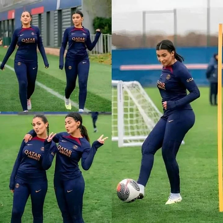 Многие посчитали, что все девушки на фото – футболистки, но это не совсем так. Справа – известная во Франции блогер и звезда соцсетей Nourhene, которую клуб позвал посетить тренировку. На других кадрах она позирует с Сакиной Каршауи – вот она действительно играет за «ПСЖ».