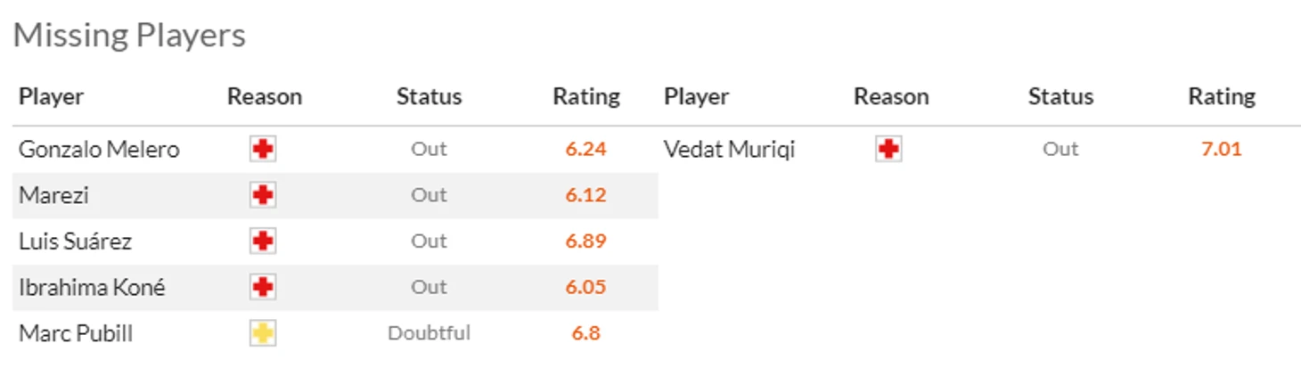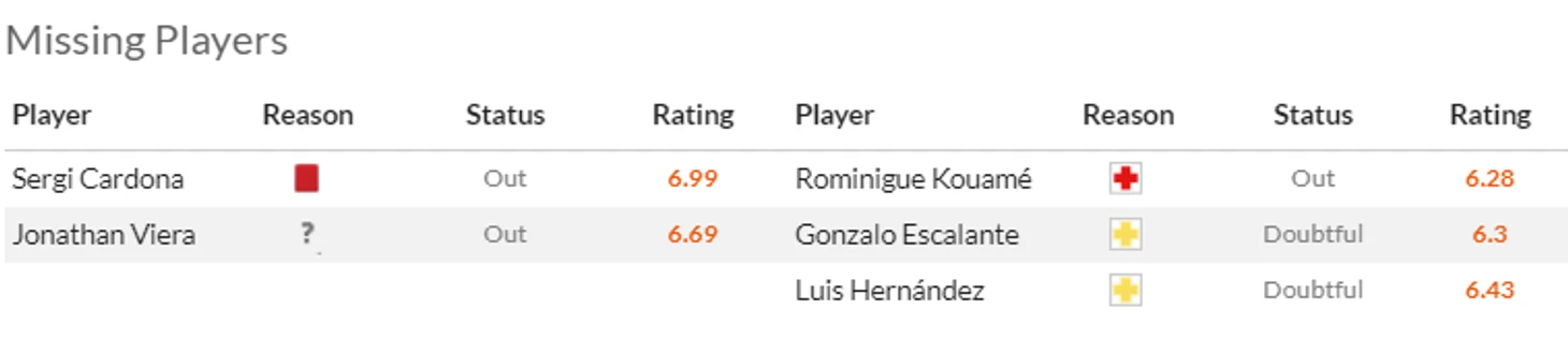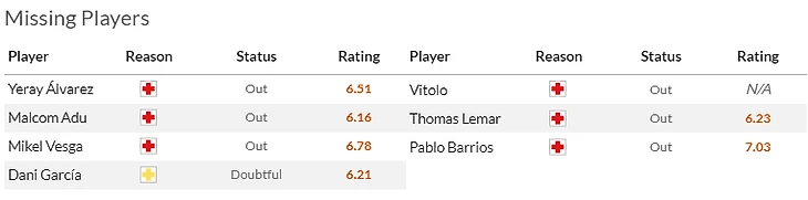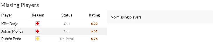 На что обратить внимание: На Хонатана Виеру(7). На этой неделе полузащитник и Лас-Пальмас официально расстались. Грустная получилась концовка у этой истории. Ну а кроме покинувшего команду хавбека Гарсия Пимьента не слишком уверен в доступности поврежденных Лемоса(5,5) и Сандро Рамиреса(7).