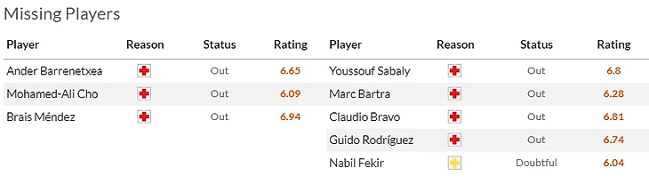 Сосьедад же напротив уверенно вышел в плэйофф Лиги Чемпионов с первого места и сейчас тревожится главным образом в связи с массовыми потерями в центре поля. Из за травм не могут помочь команде и Браис Мендес(8) и Андер Барренечеа(6,5).. и Чо(7).