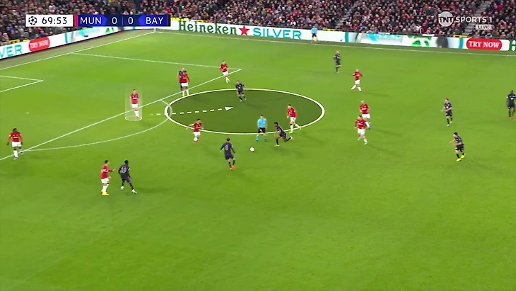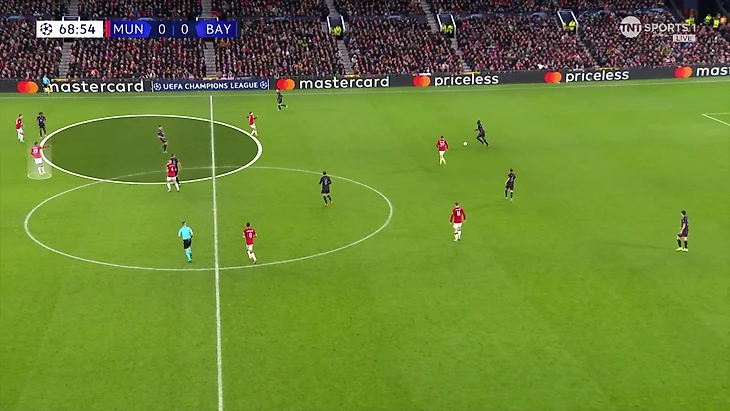 В финальном матче «Юнайтед» использовал персональные ориентировки в центре полузащиты. Из-за этого при опусканиях в опорную зону регулярно теряли Харри Кейна и Джамала Мусиалу. Либо за ними выдвигается центральный защитник, либо «Бавария» получает свободного игрока.