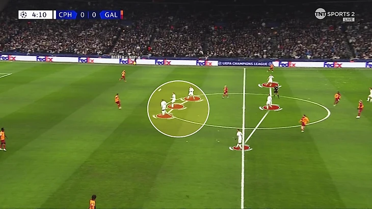 Отличительная черта – при обороне команда не садилась в 4-1-4-1, как большинство команд, использующих эту формацию. Они сохранили узкие 4-3-3. При прессинге так делают «Ливерпуль», «Ньюкасл» и другие, но «Копенгаген» оборонялся этим блоком без высокого давления. Огромный объем работы ложился на центральных полузащитников, которые по ширине могли располагаться даже шире, чем игроки в атакующей тройке.