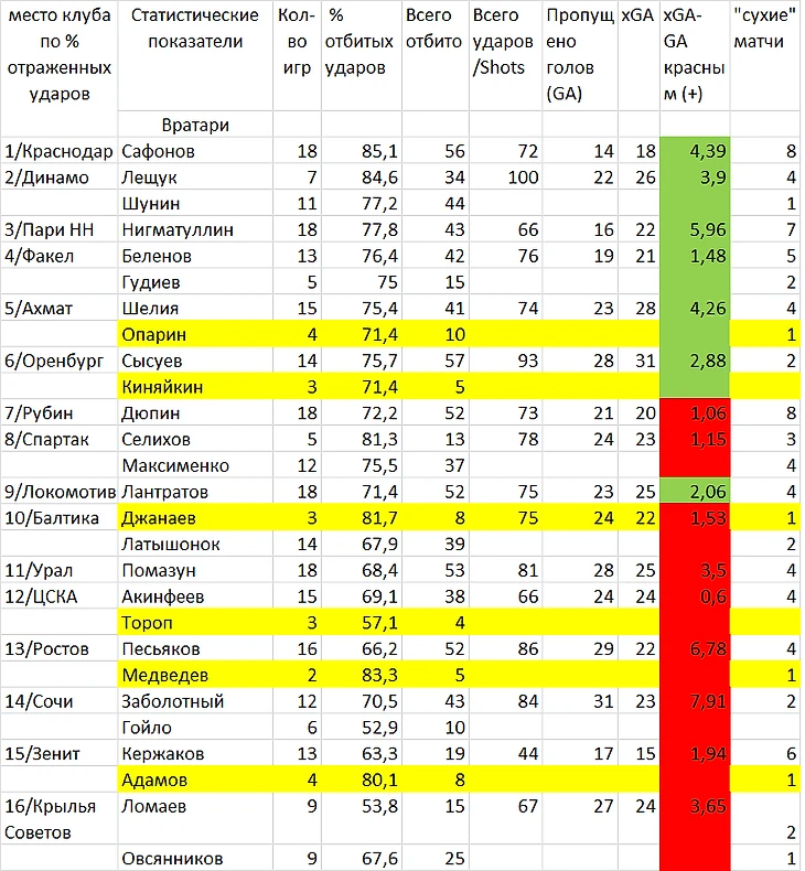 Обычным критерием игры вратарей считают процент отраженных ударов. Составим и мы таблицу по этому принципу, разделив внутри клубов показатели разных вратарей. При этом игроков, сыгравших меньше 2 полных игр, учитывать не будем, т.к. их показатели вряд-ли кому-то интересны. Желтым выделены вратари, сыгравшие больше 2 игр, но менее 5. Их показатели зачастую очень примечательны, но из-за малой выборки (меньше 30%) не очень надежны. Помимо количества игр, в таблицу внесены абсолютные величины отбитых ударов и их общее количество на команду. Из продвинутой статистики UnderStat.com взяты ожидаемые голы, созданные соперниками, а также разница между ними и реально пропущенными мячами. Этот столбец «расцвечен» в зеленый (если пропустили меньше, чем создал соперник) и красный (если больше) цвета. Ну и просто для любителей статистики приведены «сухие» игры вратарей.