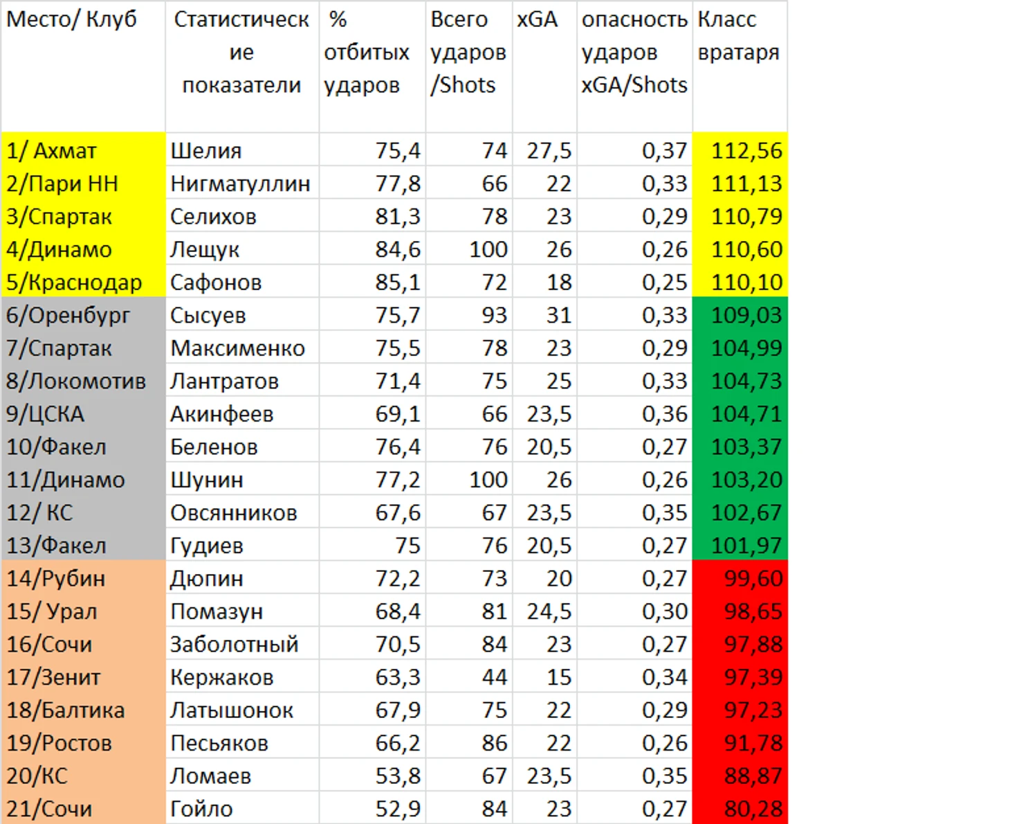 Получившийся результат кажется наглядным и легко интерпретируемым. До 100% - ненадежные вратари, до 110% - хорошие вратари, свыше 110% - элитный класс. Цвет подсветки клубов - условно напоминает медали на пьедестале. Еще раз повторю - результаты по «парам вратарей 1-го клуба» не совсем объективны, поскольку опасность ударов бралась усредненная. Поэтому Лещук/Шунин и Селихов/Максименко в в разных группах возможно просто из-за методики.