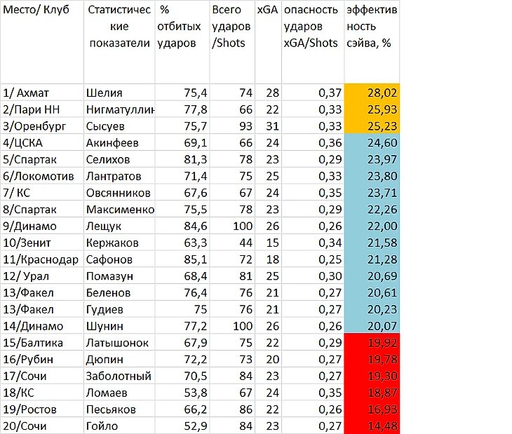 Немного странная получилась таблица. И даже продвинутая статистика не помогает: казалось бы, чем больше зеленая цифра, тем лучше вратарь, а чем больше красная - тем хуже. Но Сафонов например имеет 4,4 на 1 месте, а Нигматуллин почти 6 на 3.При том, что корреляция с основным показателем отбитых ударов прослеживается: зеленая зона ближе к верху таблицы, а красная - к «подвалу». На мой взгляд это происходит потому, что показатель отбитых ударов никак не учитывает опасность отраженных ударов. Как его учесть? На мой непросвещенный взгляд может помочь коэффициент «средней опасности удара», равный отношению созданных соперником ожидаемых голов к общему числу ударов (xGA/shots) и «% эффективности сэйва», получаемый умножением «опасности удара» на общий «% отраженных ударов». В физическом смысле он означает сколько опасности в среднем теряет удар соперника в результате игры вратаря.