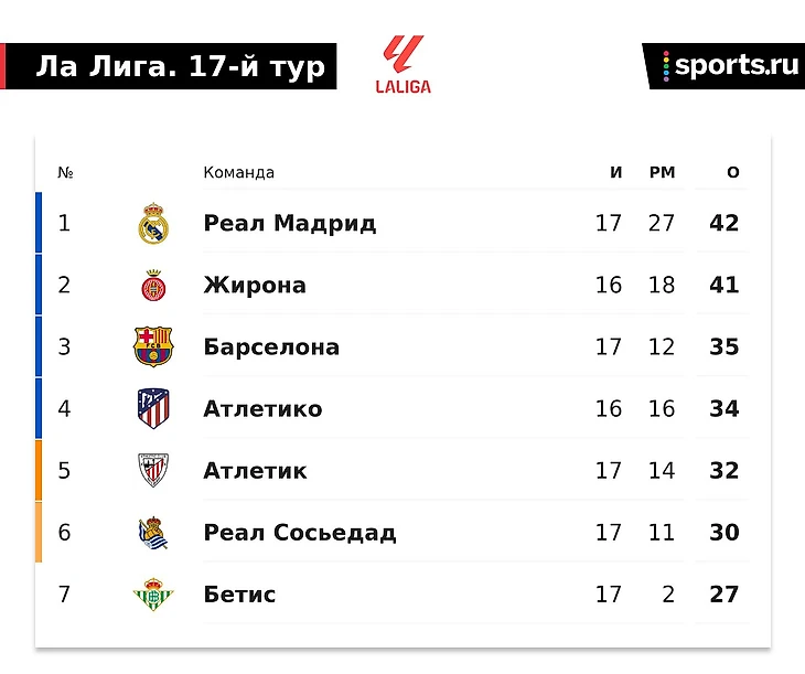 «Реал» как минимум временно вышел на первое место Ла Лиги – перед игрой «Жироны» (она в понедельник) и оторвался на семь очков от «Барселоны», сыгравшей вничью с «Валенсией».