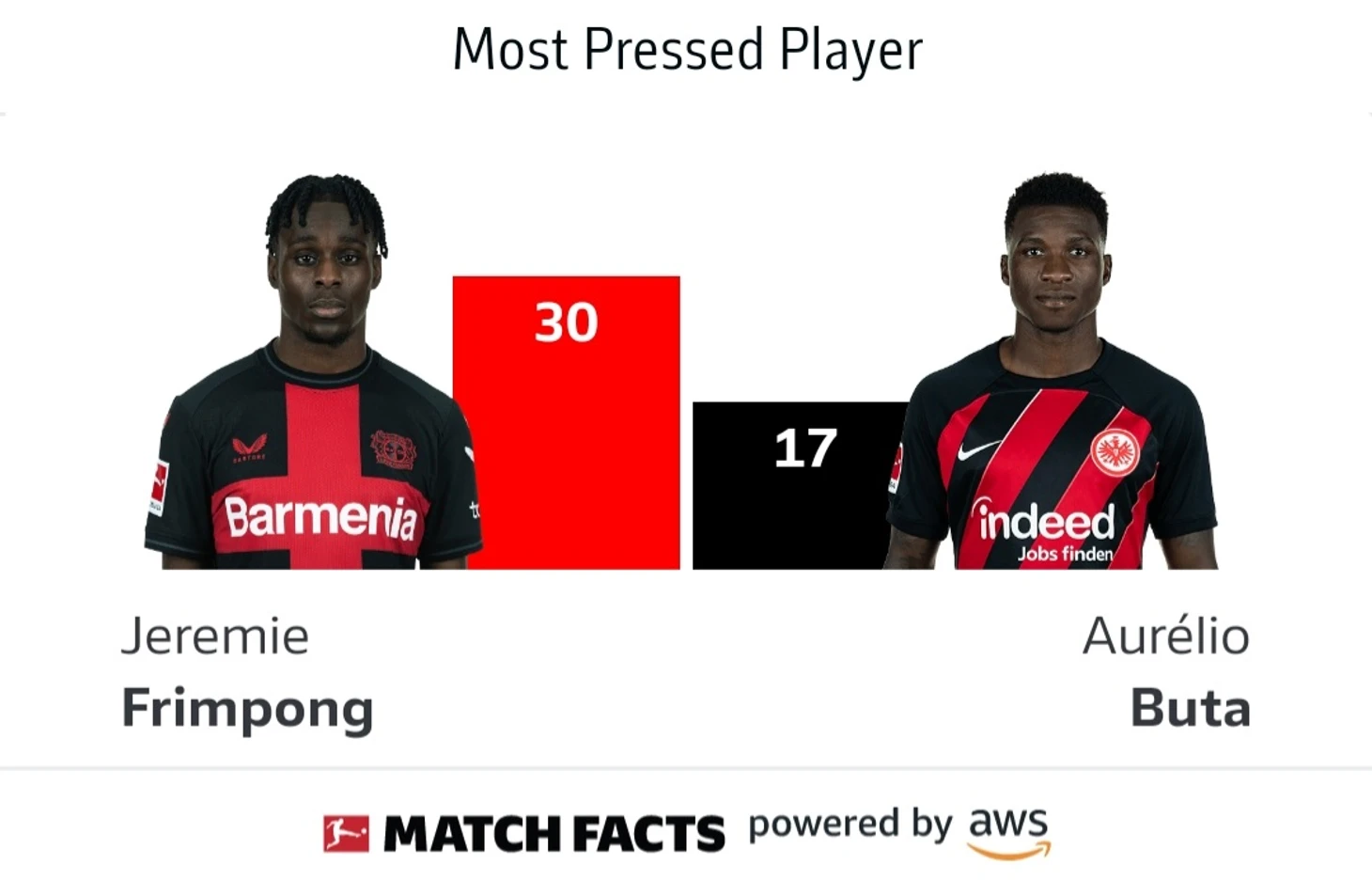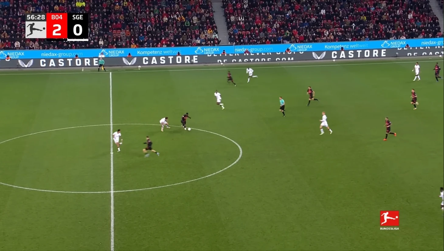 Первая возможность после перерыва принадлежала Флориану Вирцу, который на 51-й минуте он пробил по воротам Траппа. Но мяч прошёл немного левее ворот. Буквально через минуту Джереми Фримпонг добился большего успеха: он добил мяч в сетку после удара Бонифаса, сделав счет 2–0.