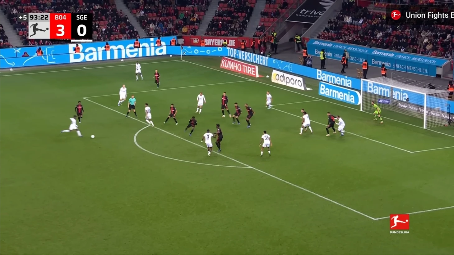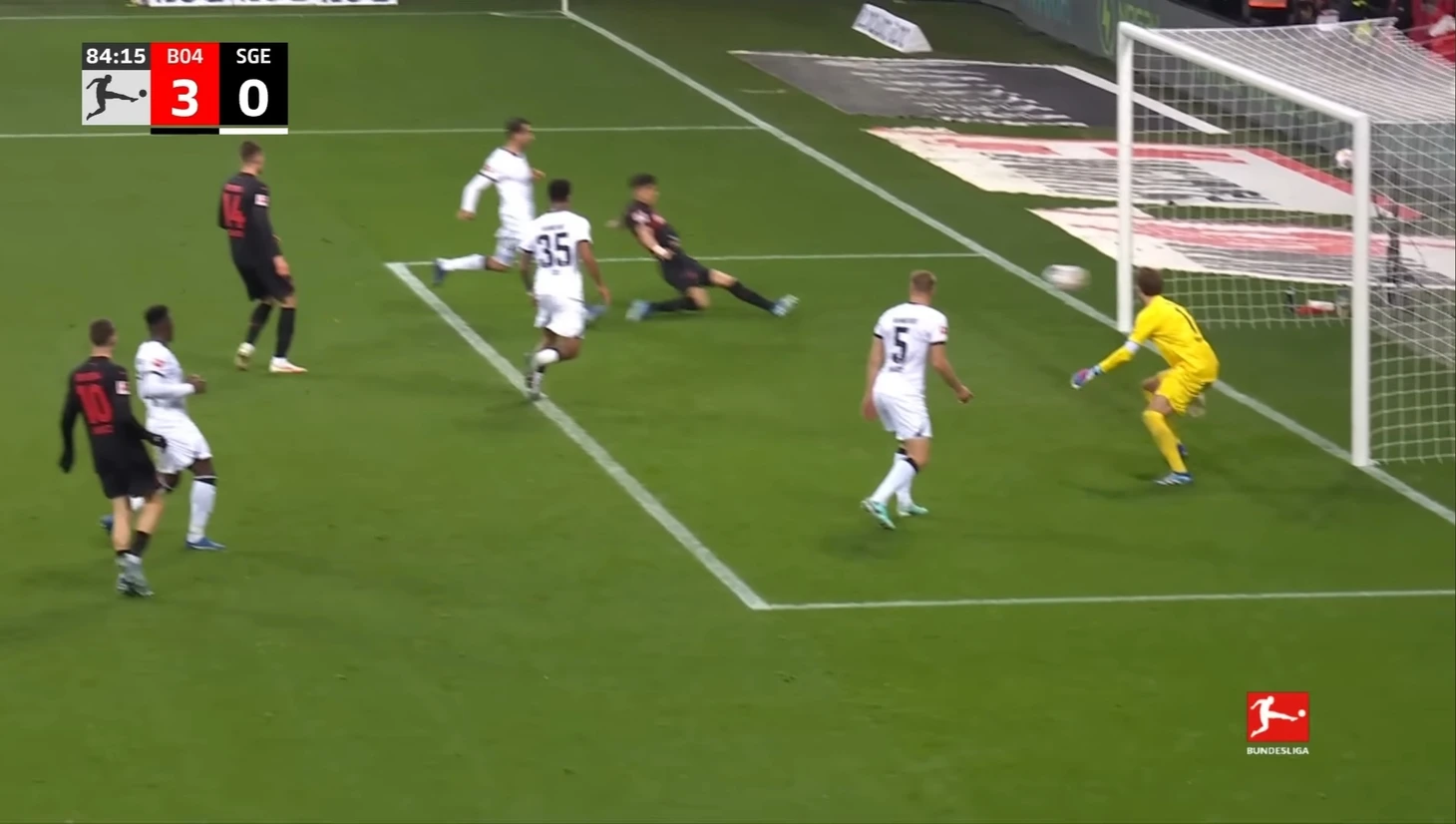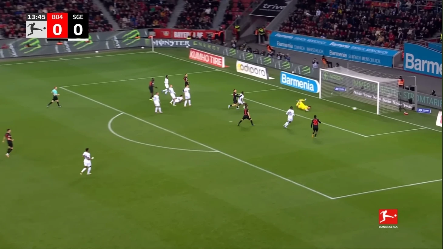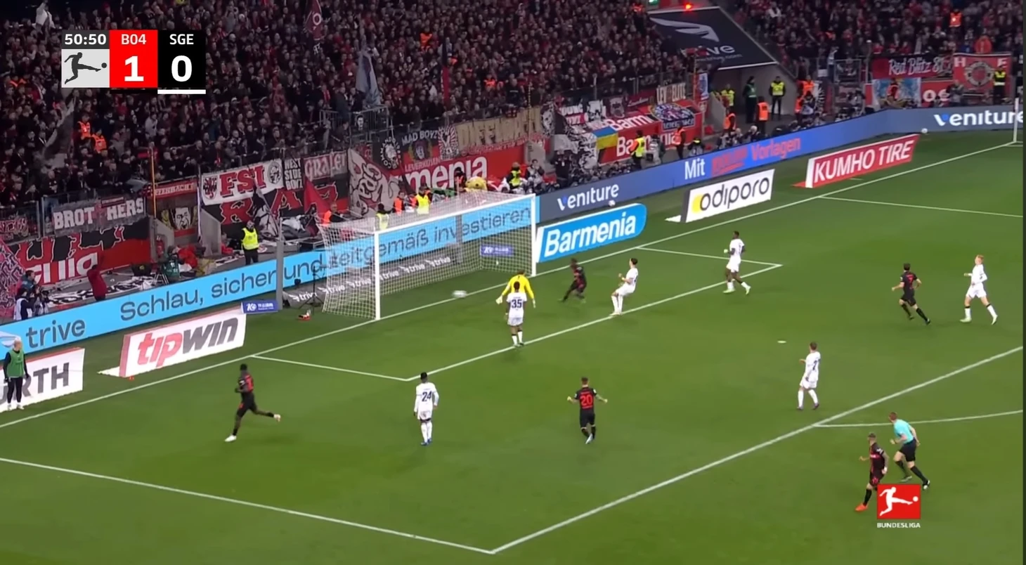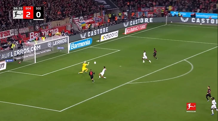 Уже в добавленное время у Байера был ещё один шанс забить. Телла вышел один на один с Траппом, но Пачо в последний момент в подкате выбил мяч из-под ног Теллы. Вроде бы очевидный пенальти, но арбитр, пересмотрев эпизод на VAR ничего не назначил.