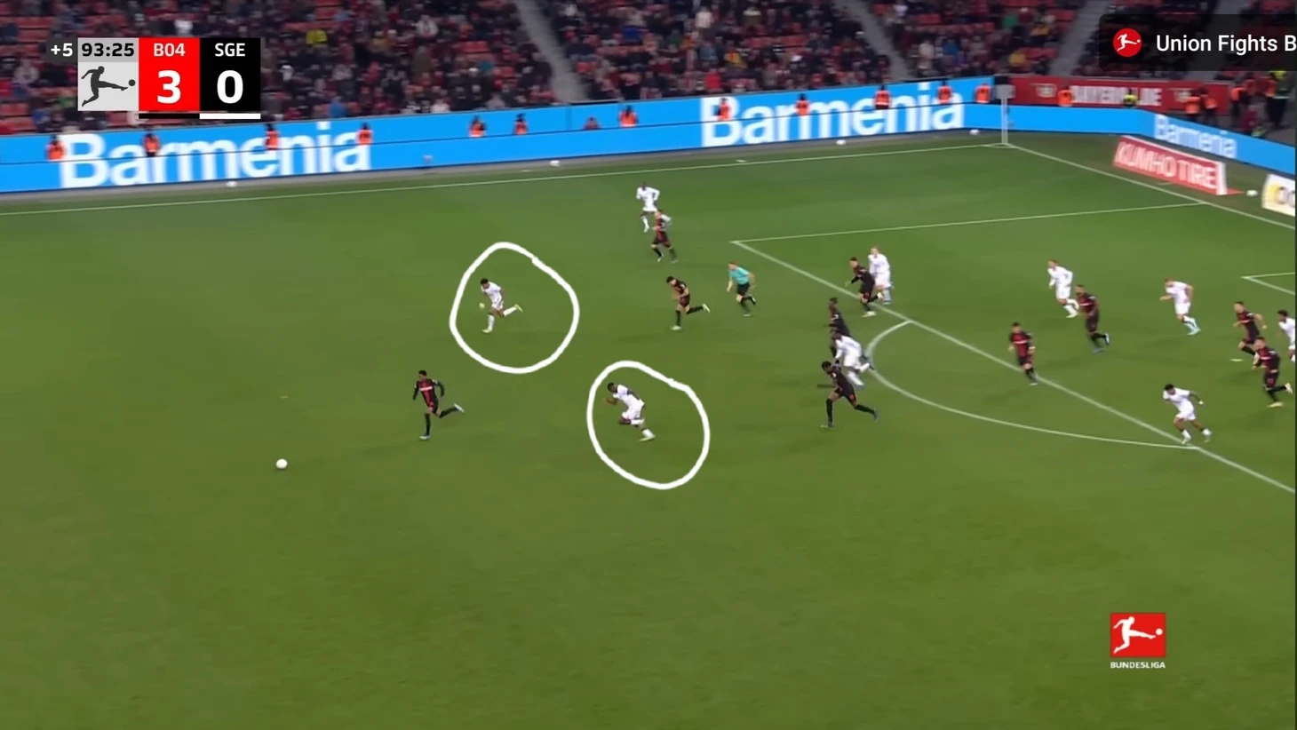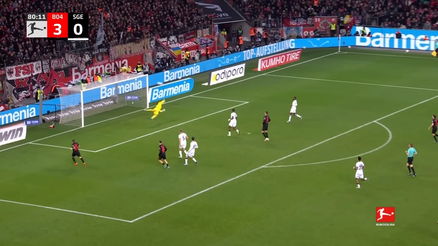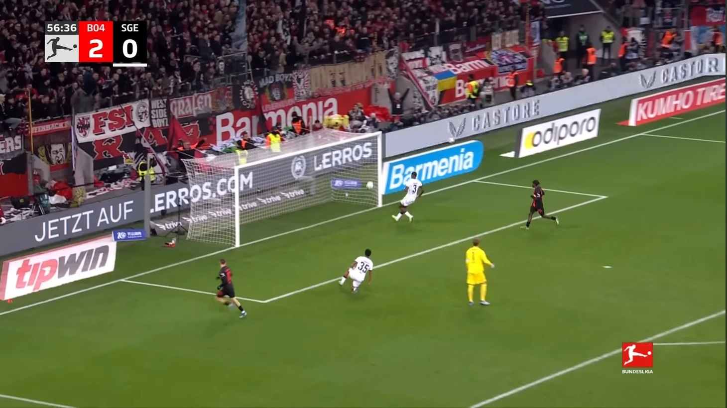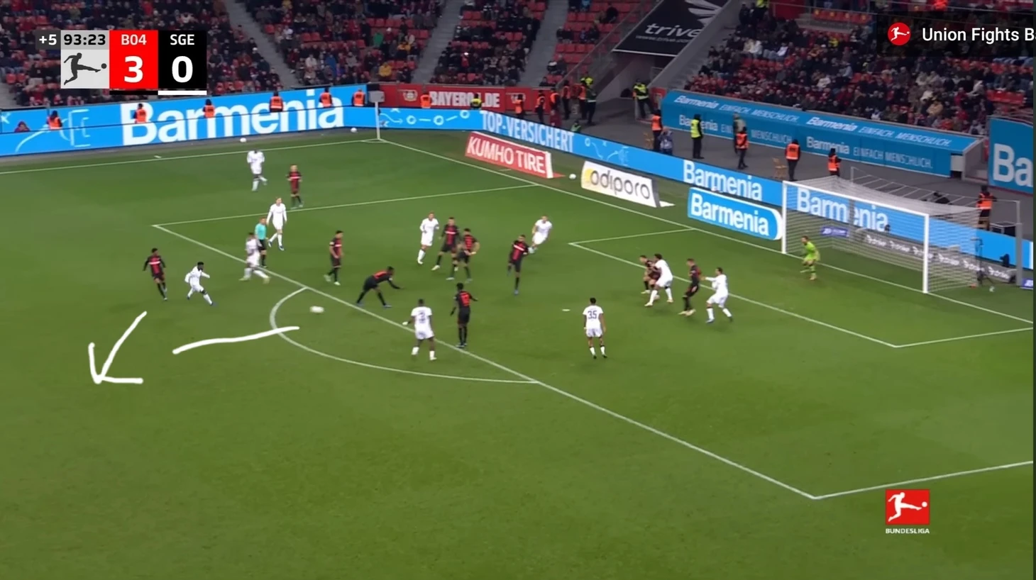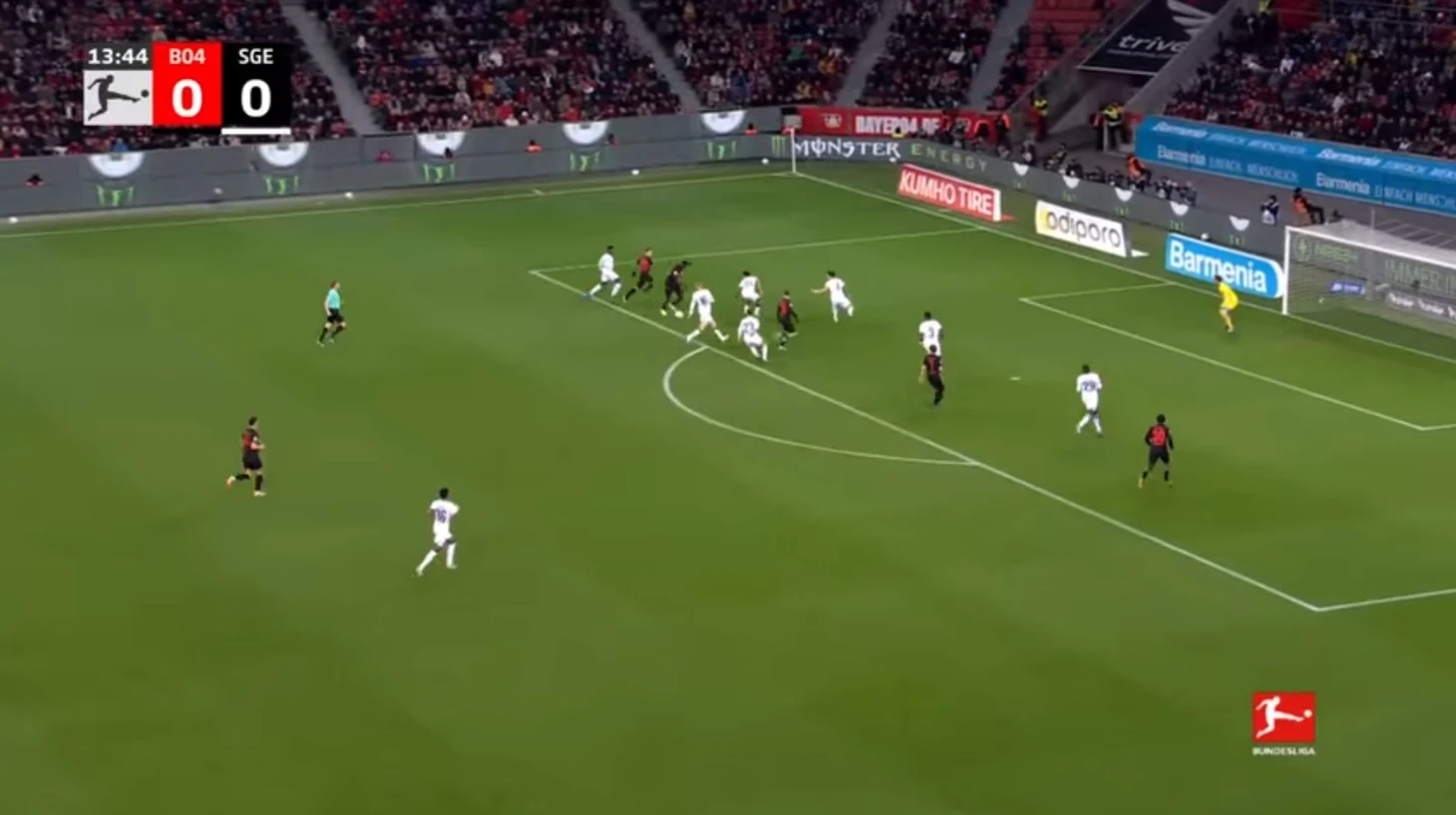Уже в добавленное время у Байера был ещё один шанс забить. Телла вышел один на один с Траппом, но Пачо в последний момент в подкате выбил мяч из-под ног Теллы. Вроде бы очевидный пенальти, но арбитр, пересмотрев эпизод на VAR ничего не назначил.