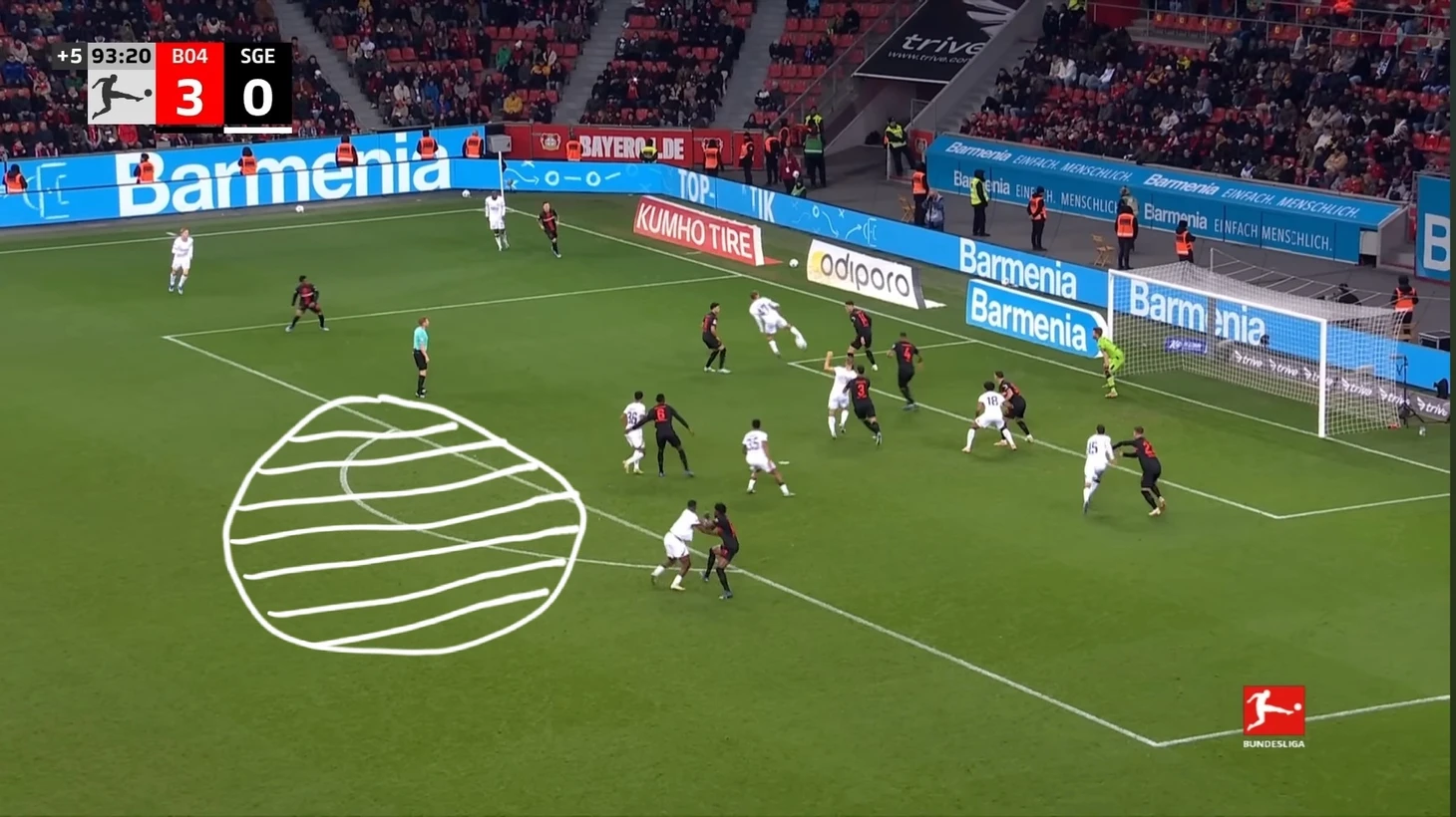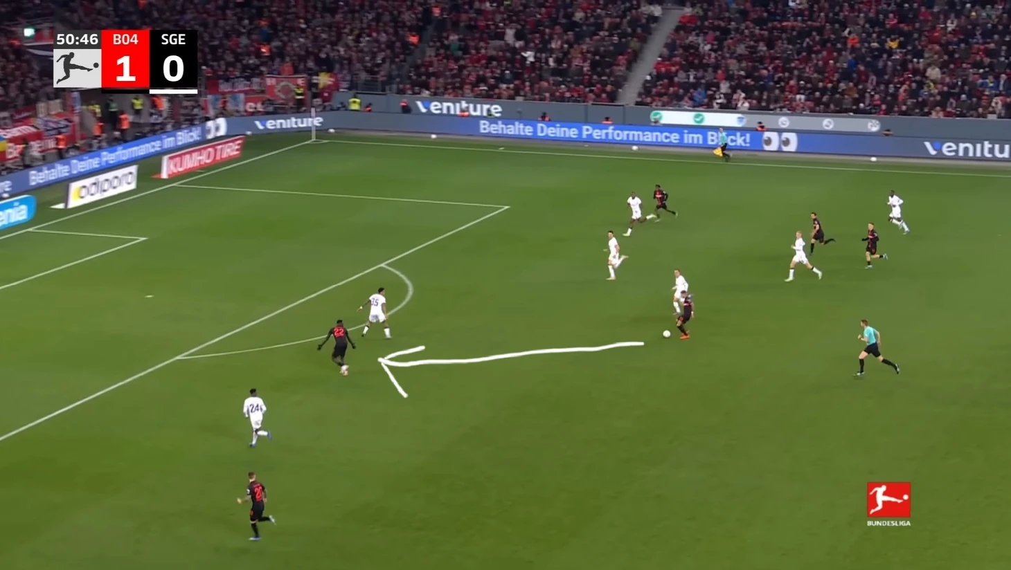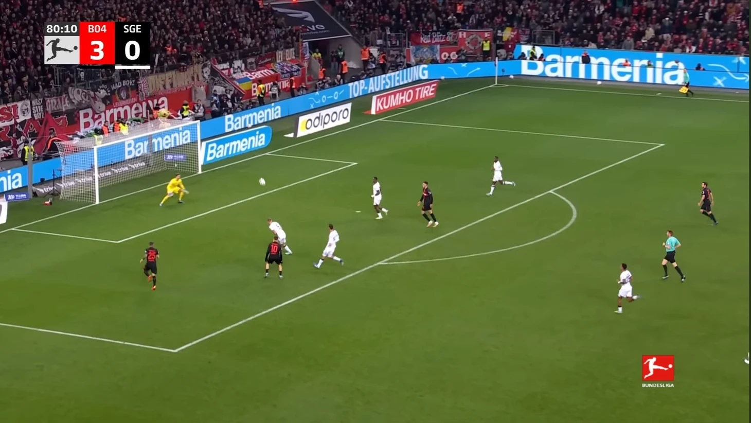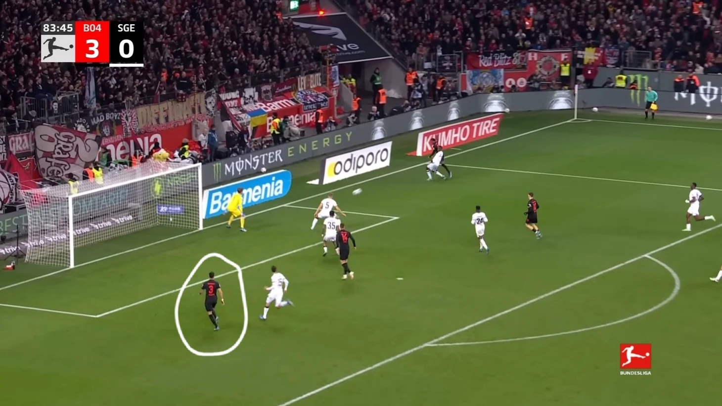 Уже в добавленное время у Байера был ещё один шанс забить. Телла вышел один на один с Траппом, но Пачо в последний момент в подкате выбил мяч из-под ног Теллы. Вроде бы очевидный пенальти, но арбитр, пересмотрев эпизод на VAR ничего не назначил.