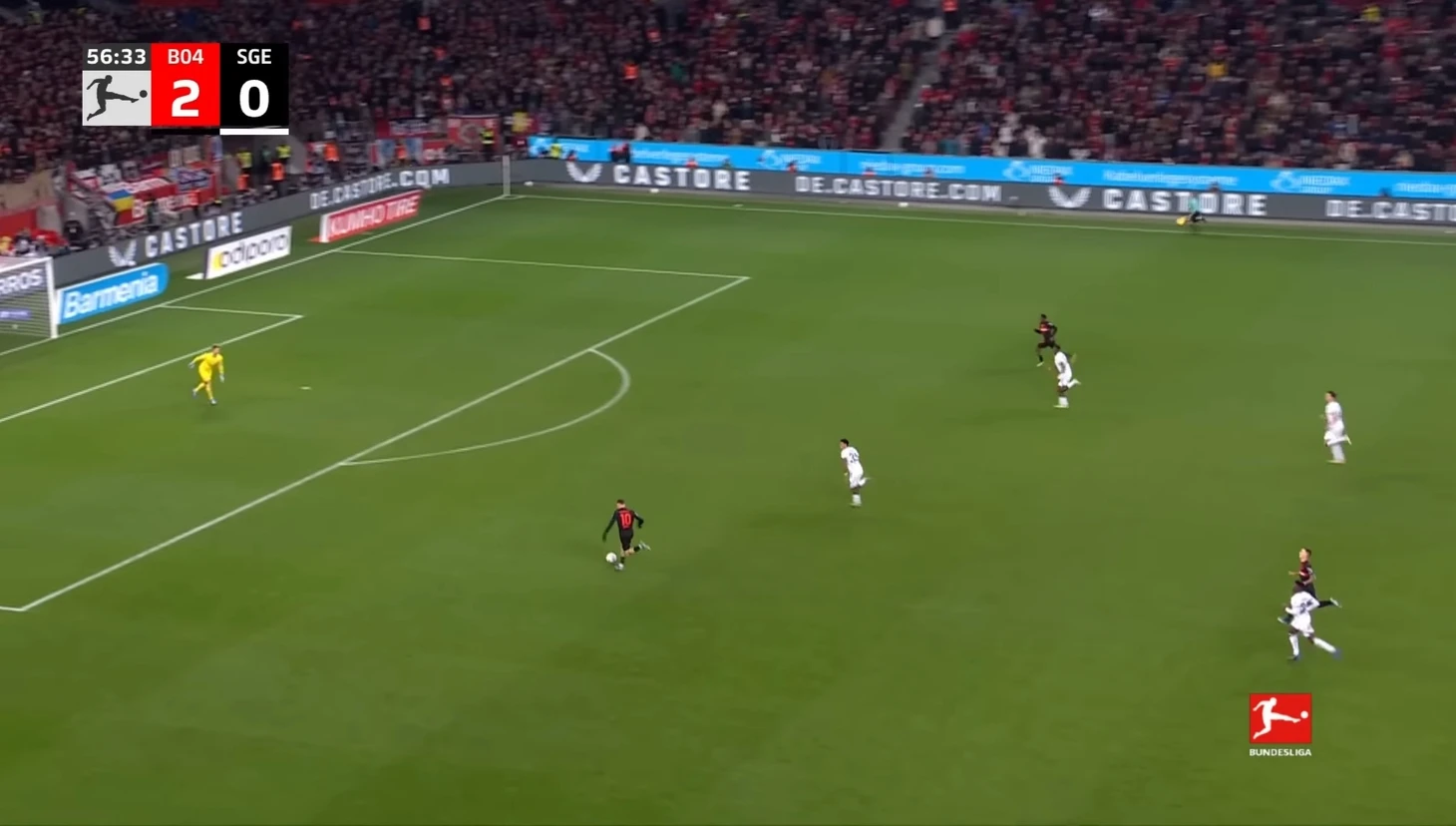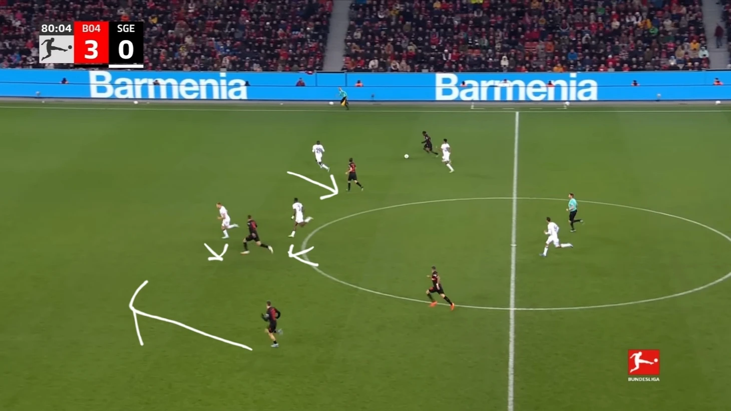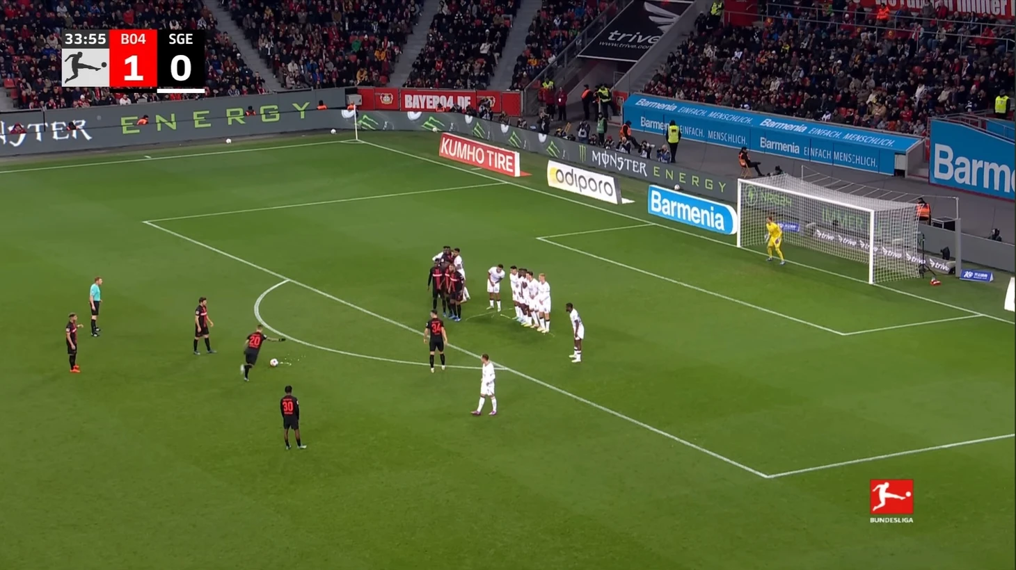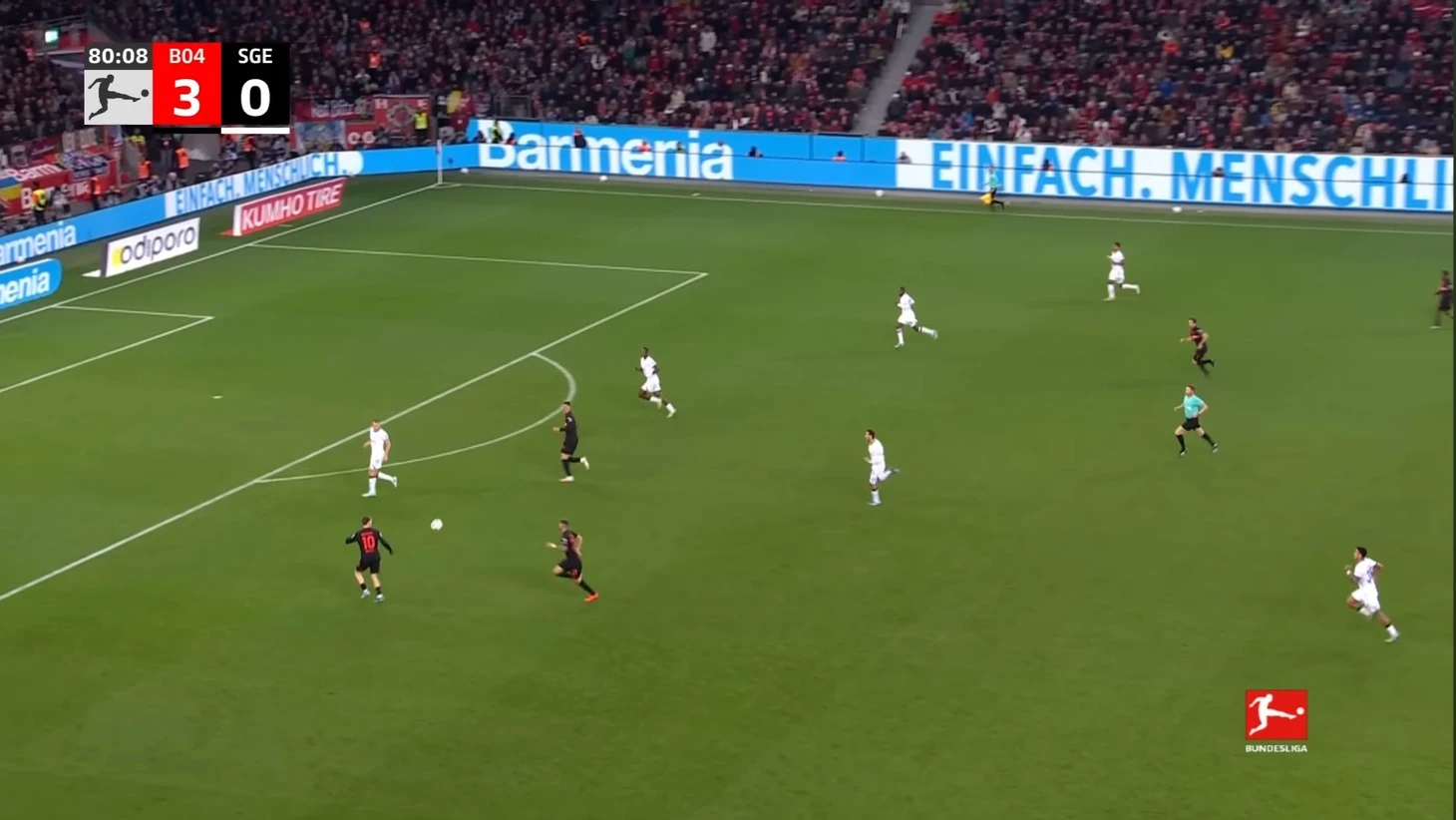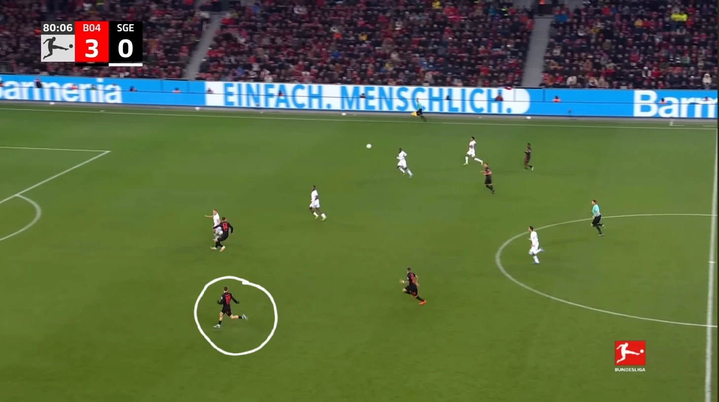 Уже в добавленное время у Байера был ещё один шанс забить. Телла вышел один на один с Траппом, но Пачо в последний момент в подкате выбил мяч из-под ног Теллы. Вроде бы очевидный пенальти, но арбитр, пересмотрев эпизод на VAR ничего не назначил.