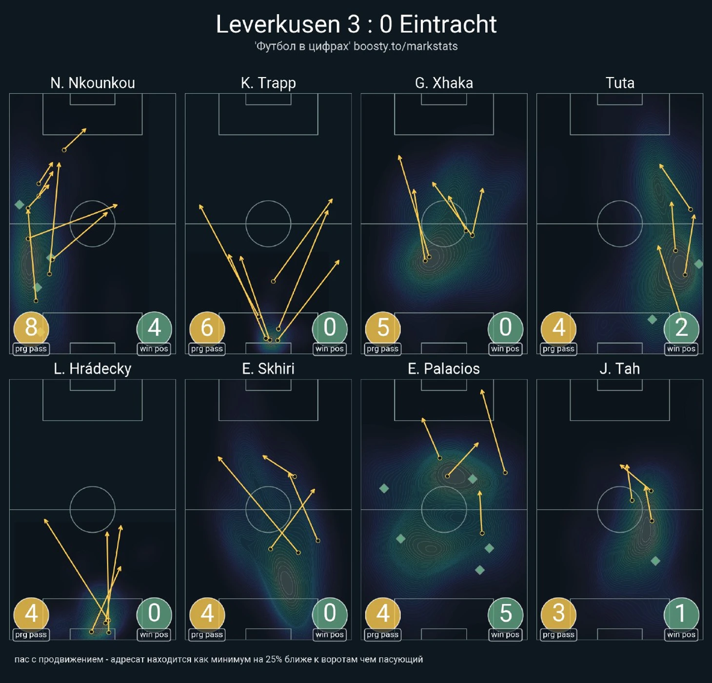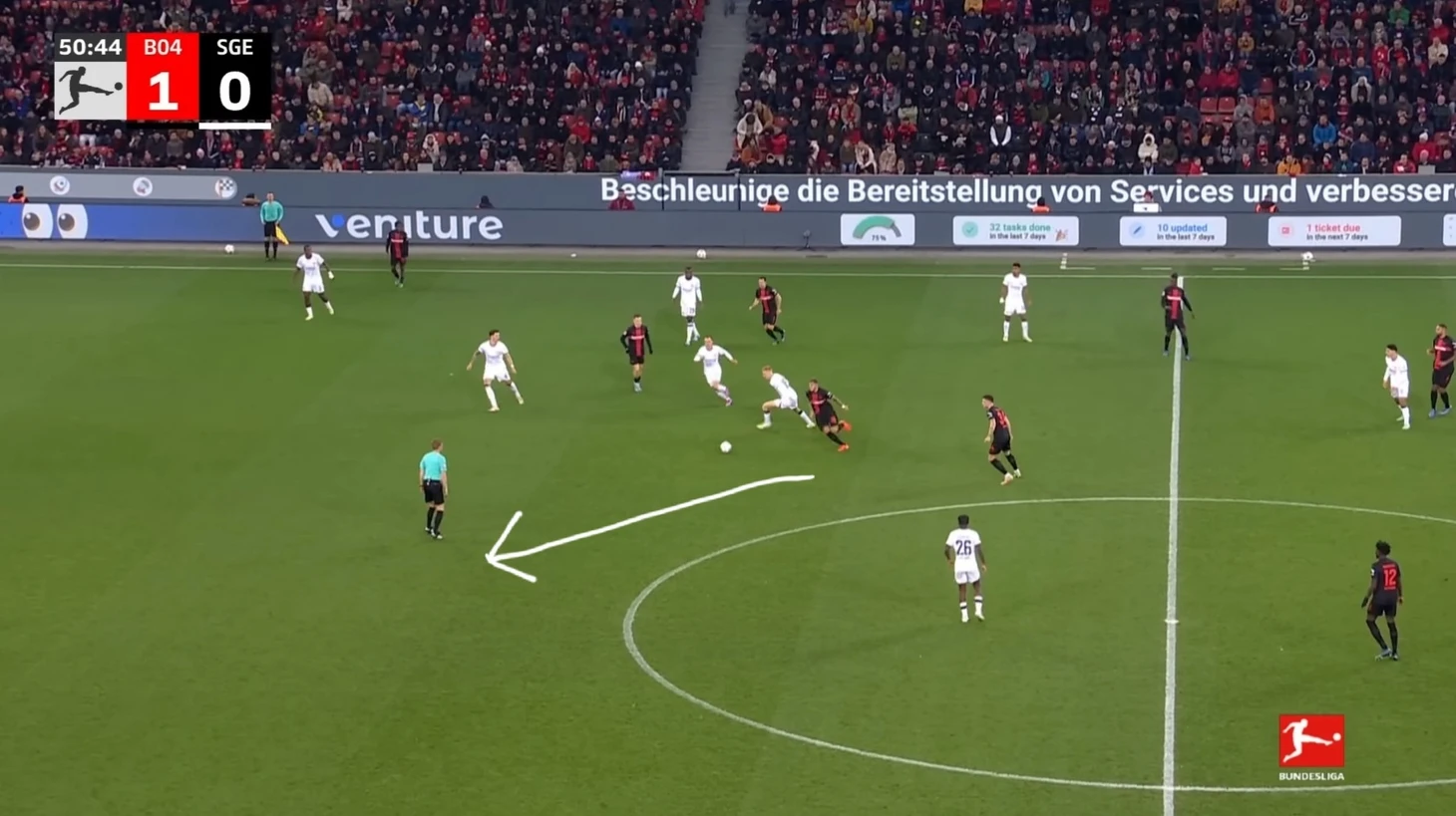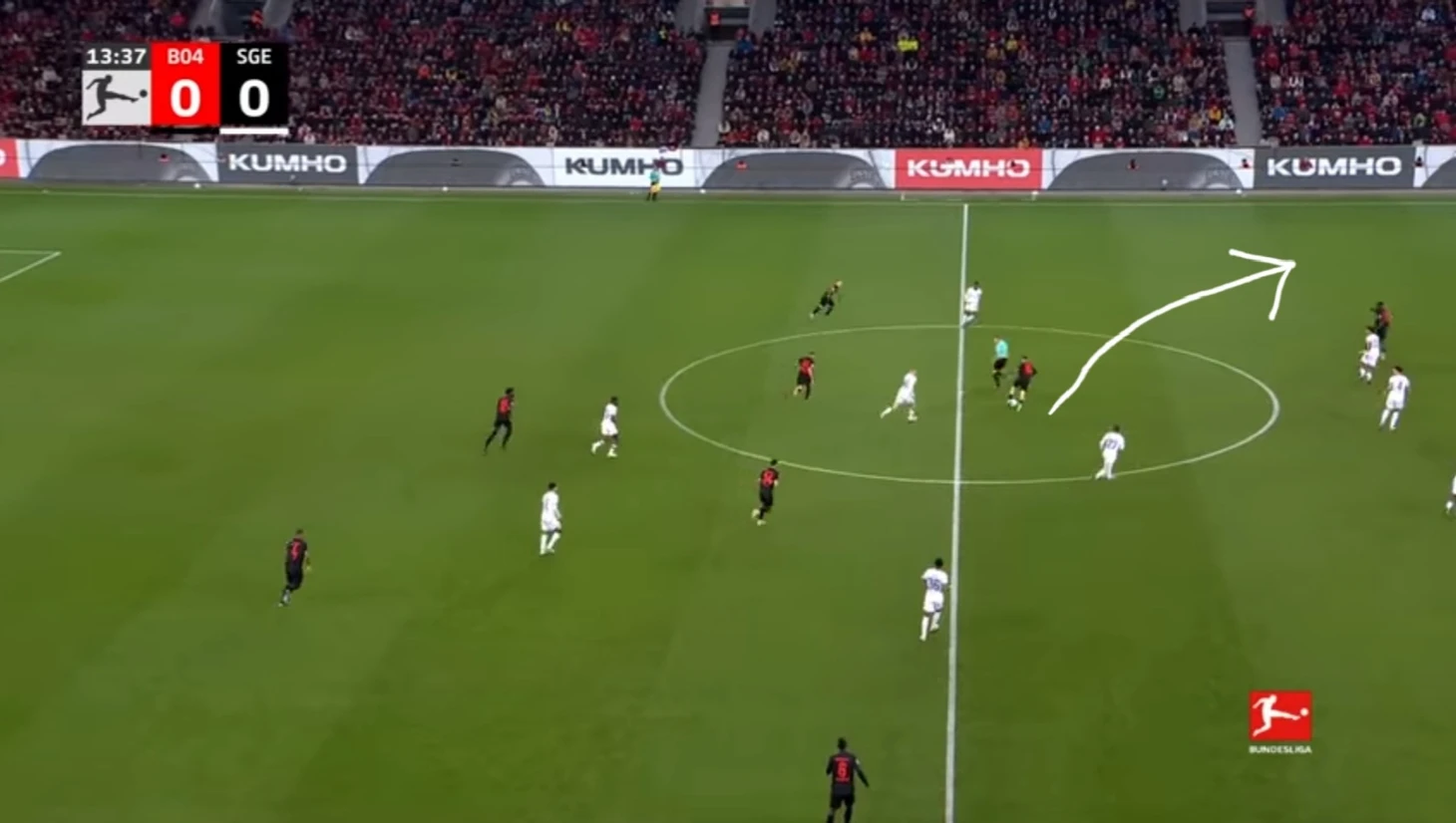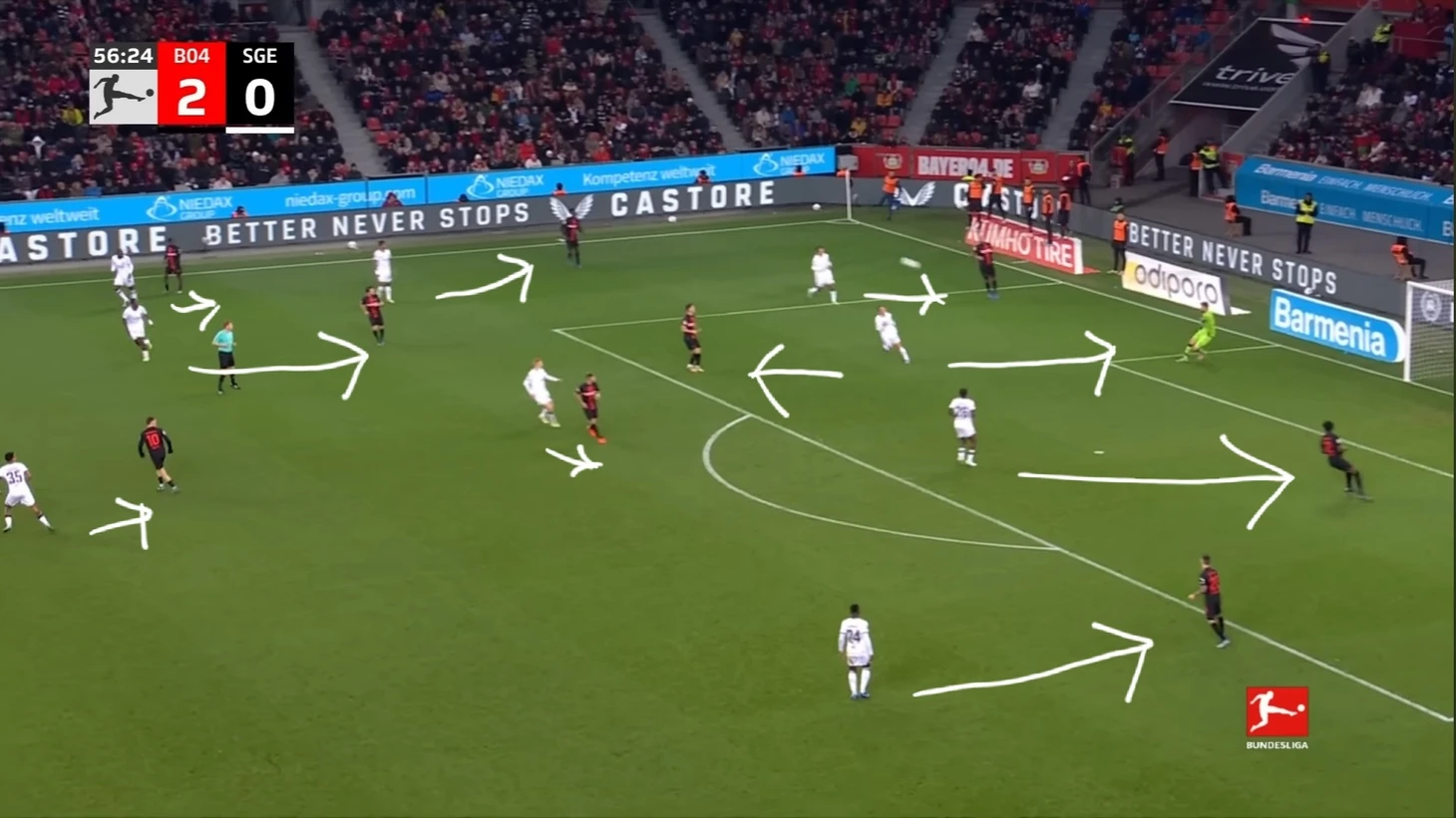 Уже в добавленное время у Байера был ещё один шанс забить. Телла вышел один на один с Траппом, но Пачо в последний момент в подкате выбил мяч из-под ног Теллы. Вроде бы очевидный пенальти, но арбитр, пересмотрев эпизод на VAR ничего не назначил.